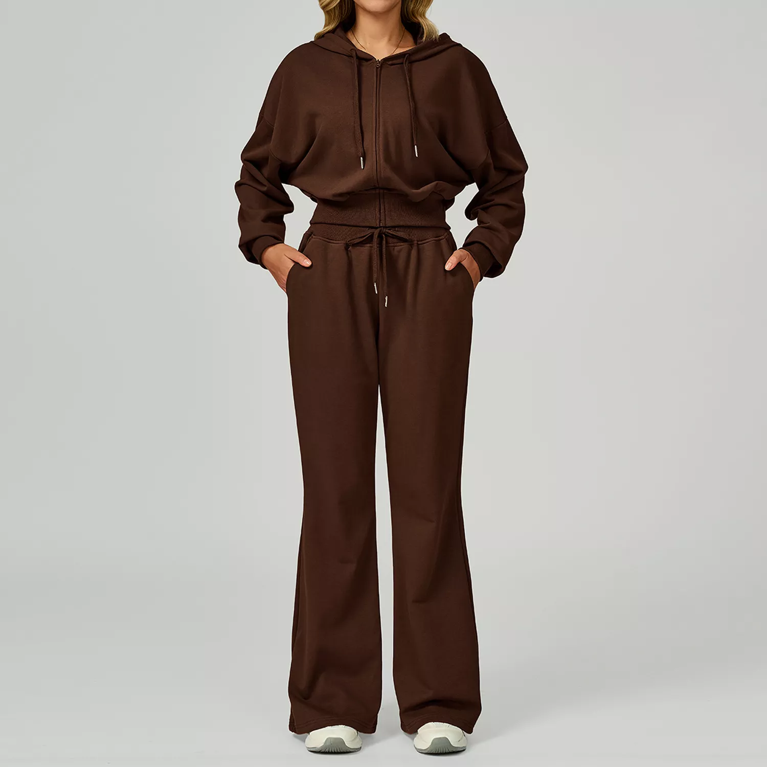 Upgrade your off-duty look with this chic 2-piece women’s set, featuring a cozy zippered hooded sweatshirt and matching straight-leg sweatpants. Designed with a relaxed fit and adjustable drawstring waist, this set is perfect for lounging, workouts, or casual outings. The soft, breathable fabric keeps you comfortable all day while maintaining a flattering silhouette that moves with you.