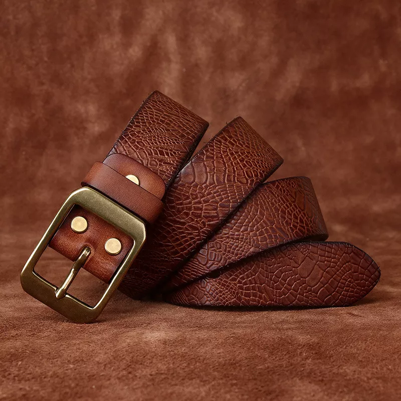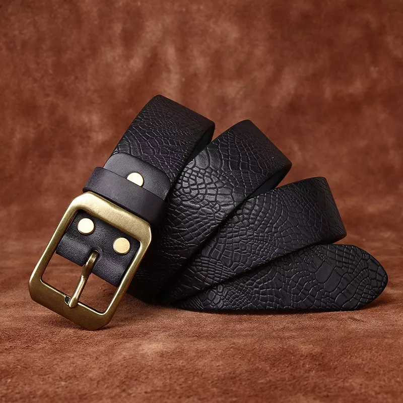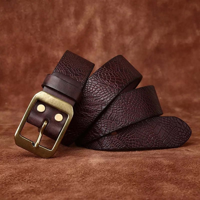 3.8CM Genuine Cowhide Leather Belt with Embossed Copper Buckle