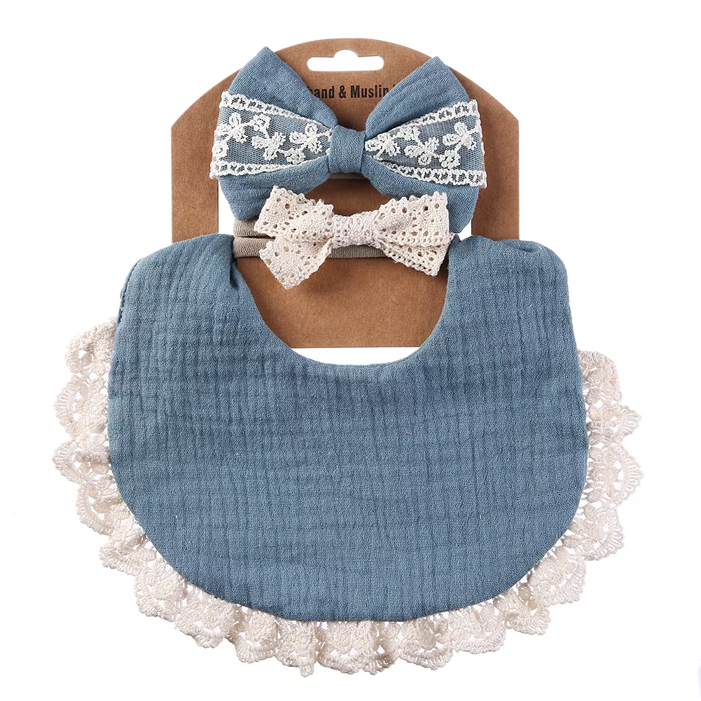 3-Piece Muslin Cotton Baby Bibs & Lace Headbands Set – Soft & Stylish