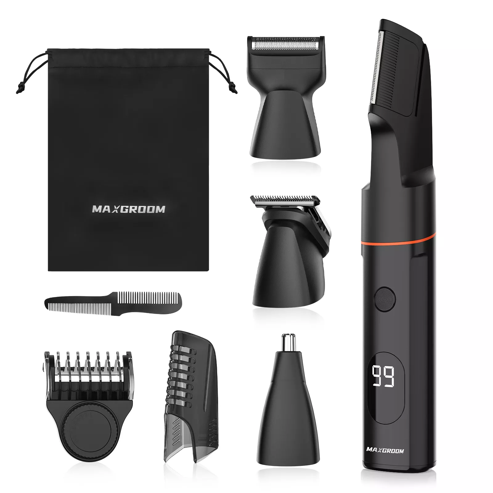 This isn’t just another trimmer – it’s designed with your comfort in mind. The hypoallergenic stainless-steel blades are skin-friendly and shaped with rounded tips to protect delicate areas like the groin, chest, and underarms. The magnetic attachments make switching heads effortless, while the V-shaped body trimmer head is crafted for those hard-to-reach spots. Plus, its compact, ergonomic design makes it easy to handle for precise control.