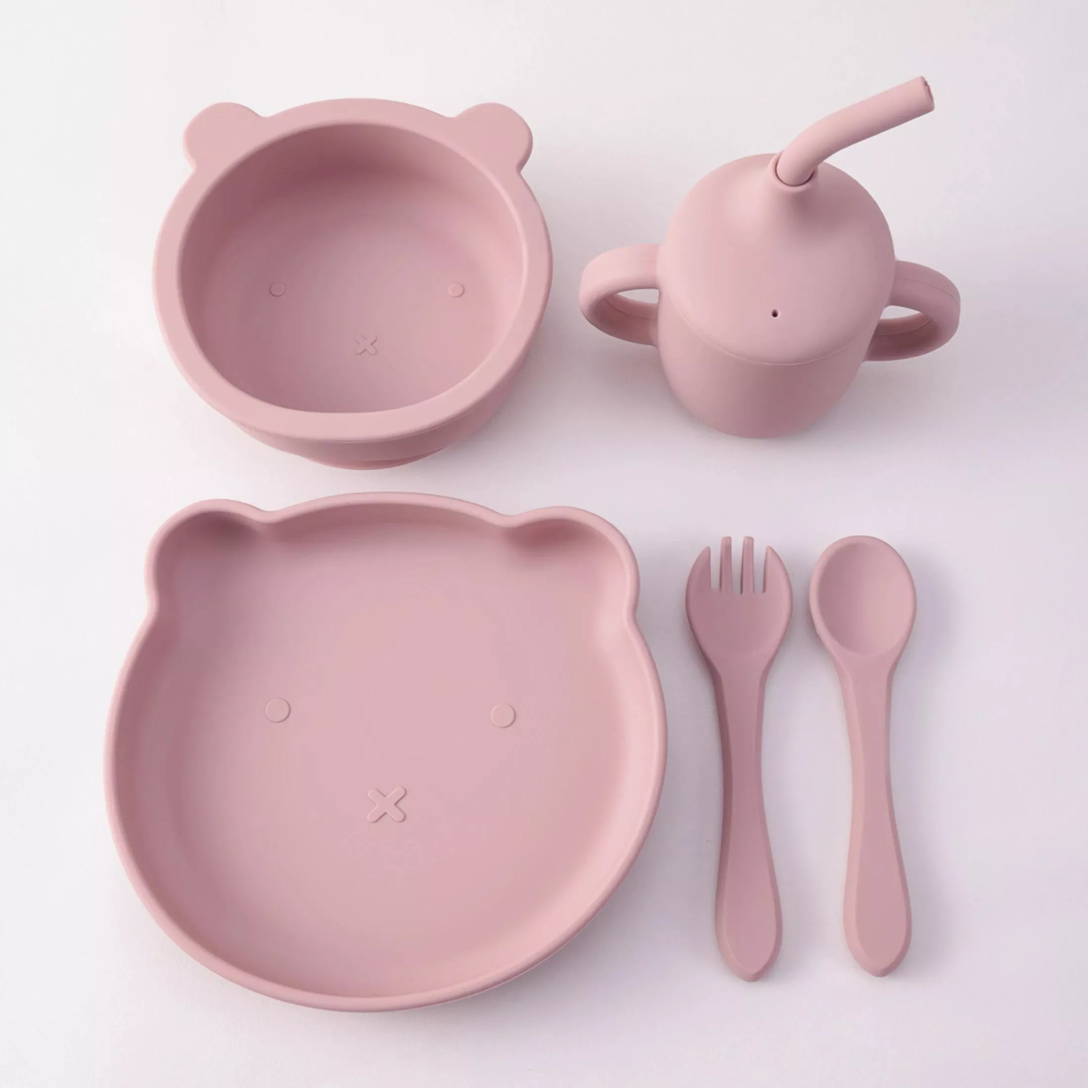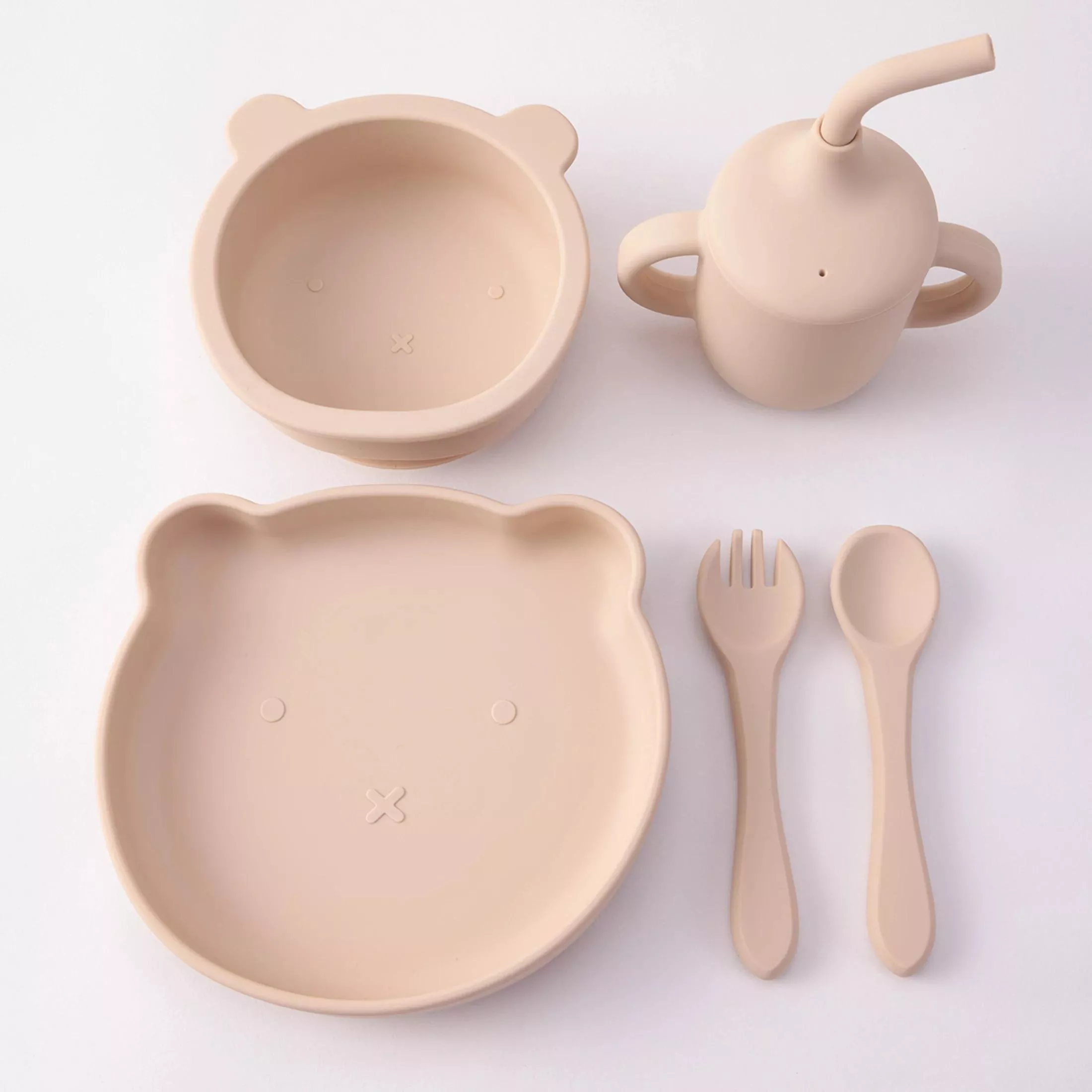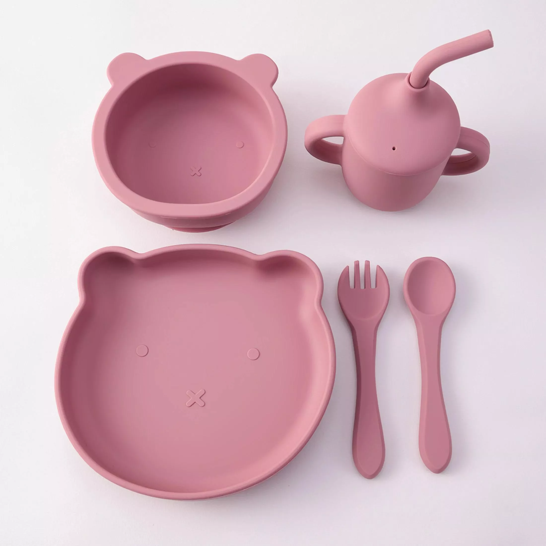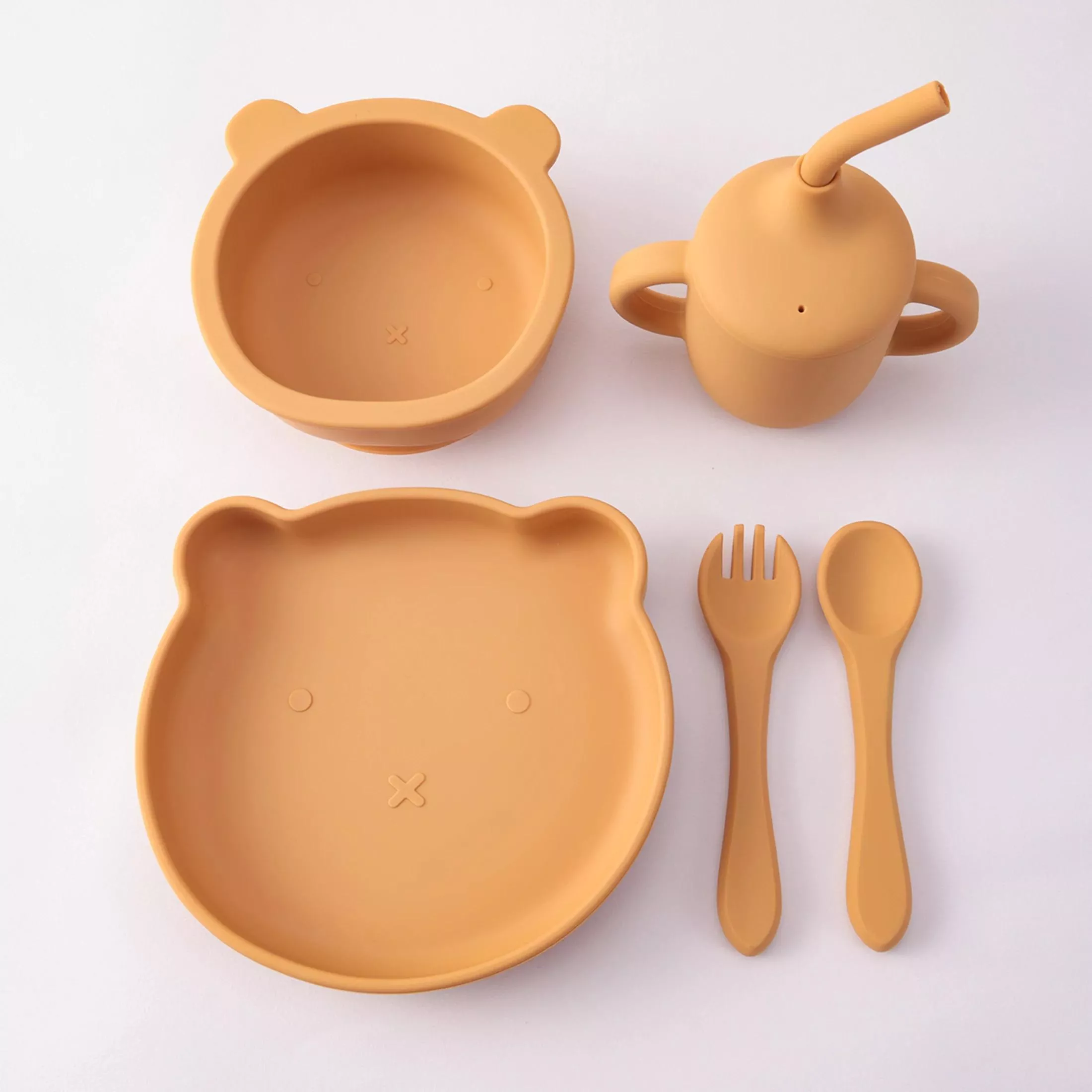 5PCS Silicone Baby Feeding Set with Bear Plate, Spoon & Straw Cup