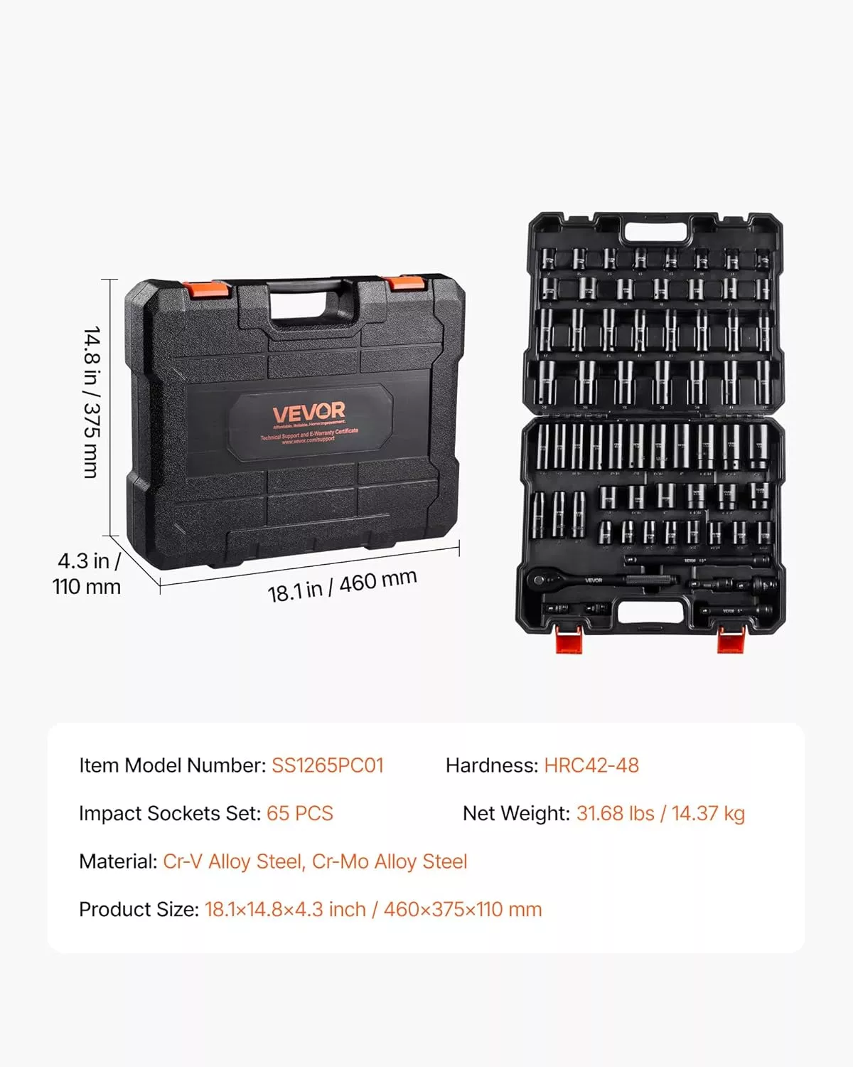 Take on demanding repair and maintenance tasks with confidence using this 65-piece drive impact socket set. Crafted from industrial-grade CR-V and Cr-Mo alloy steel, each socket is heat-treated to deliver superior impact resistance and lasting durability. With a hardness rating of HRC 42-48, this set is engineered to handle high torque and heavy-duty use, making it an essential companion for auto repair, garage work, and professional mechanical tasks.