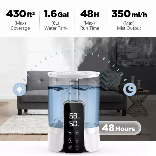 • 6L large capacity: Up to 48 hours of runtime on low mist setting