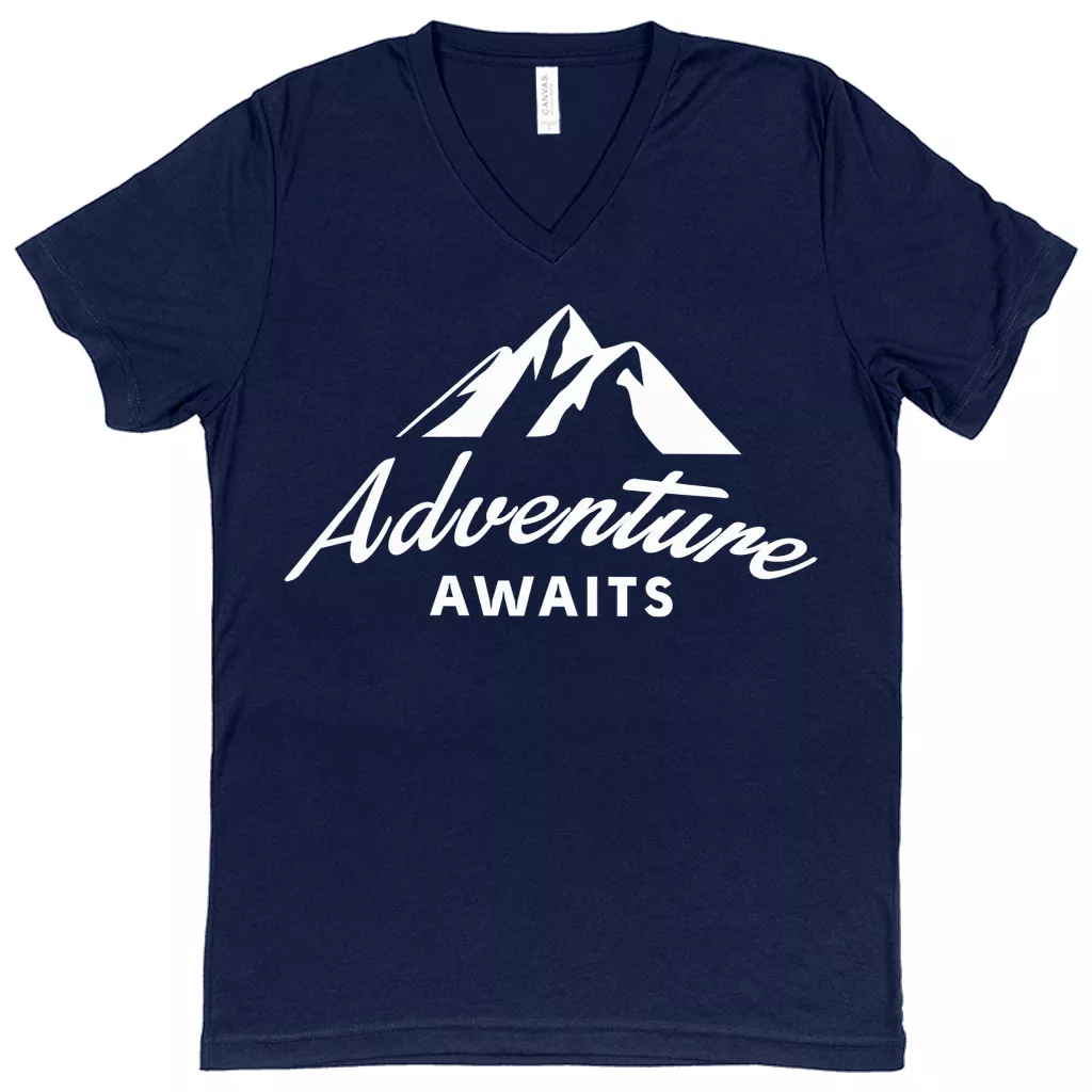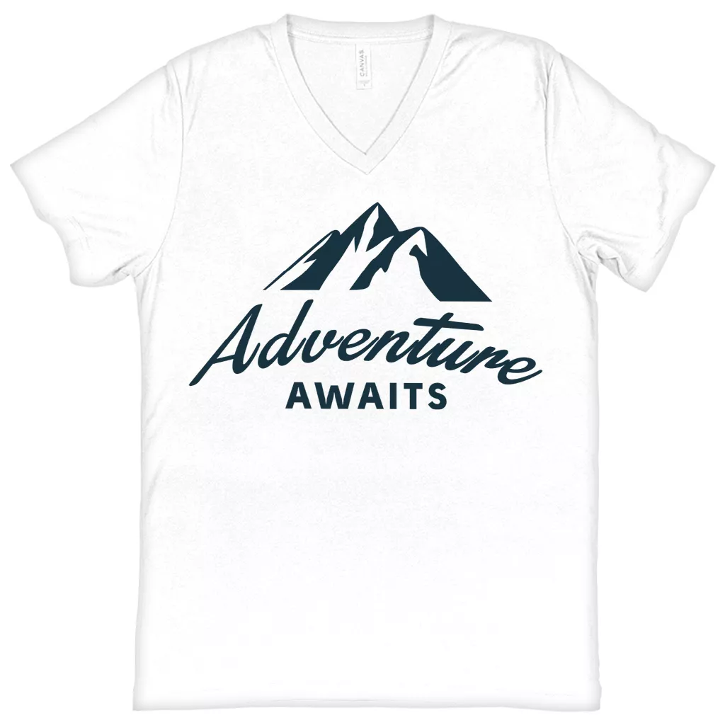Adventure Awaits V-Neck T-Shirt – Camping Basic T-Shirt – Hiking Tee