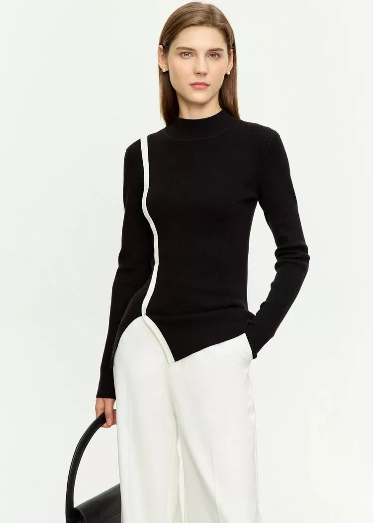 Crafted from a premium blend of nylon, acrylic, and wool, the fabric offers a lightweight yet warm feel, perfect for the crisp air of autumn and winter. The soft-knit construction gently hugs the body for a slim, tailored fit that flatters without restricting. The standout design feature? A bold, spliced asymmetrical detail that adds visual intrigue while maintaining a refined appearance.