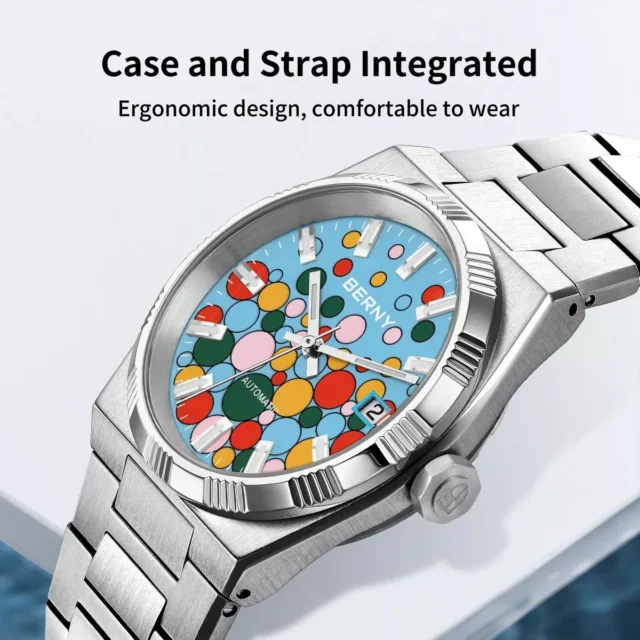 This timepiece is not just about telling time—it’s about making a statement. Whether you’re at the office, attending a formal event, or enjoying a night out, its striking dial with vibrant bubble accents adds a touch of personality and sophistication. The luminous markers ensure visibility in any light, and the integrated case and strap design provide lasting comfort for all-day wear. With a reliable mechanical movement beating at 28,800 vibrations per hour, it delivers precision you can trust.