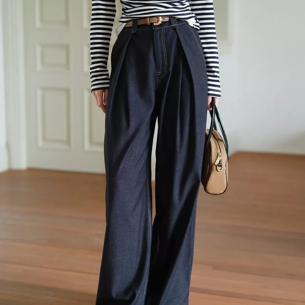 Autumn High Waist Wide Leg Denim Look Pants with Pleats & Pockets