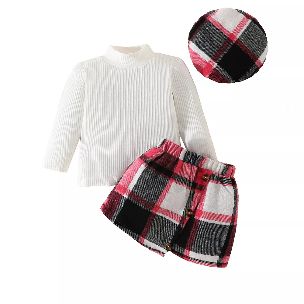 Baby Girl Autumn Outfit 3Pcs Long Sleeve Top Plaid Skirt Beret Set