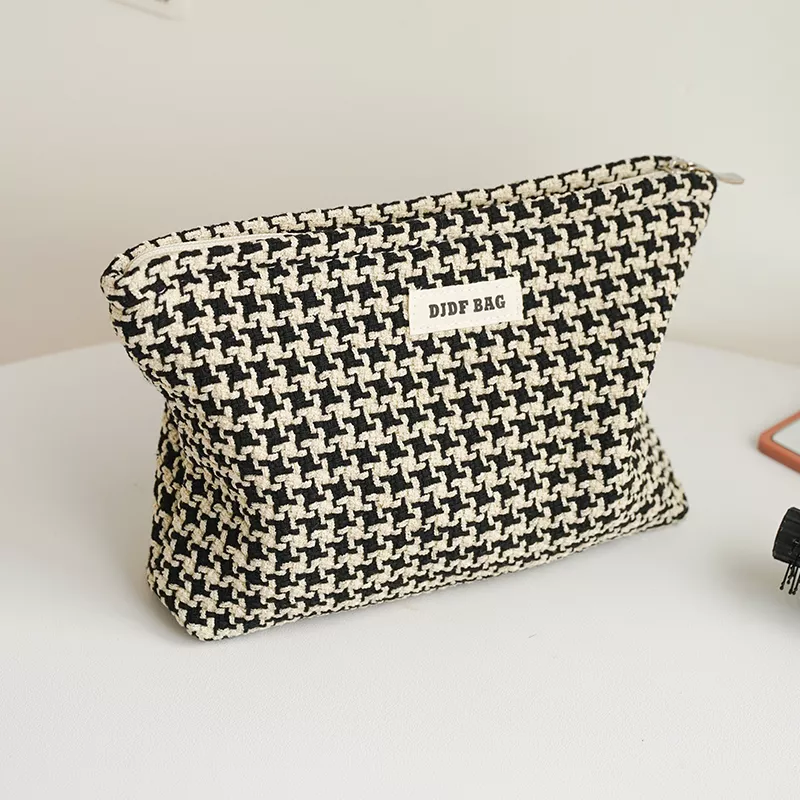 This cosmetic bag is thoughtfully crafted to be both stylish and practical. Measuring approximately 2 inches wide, it offers enough space to store daily essentials without being bulky. The houndstooth pattern adds a touch of sophistication, while the lightweight yet sturdy construction ensures it can handle travel and everyday use with ease.