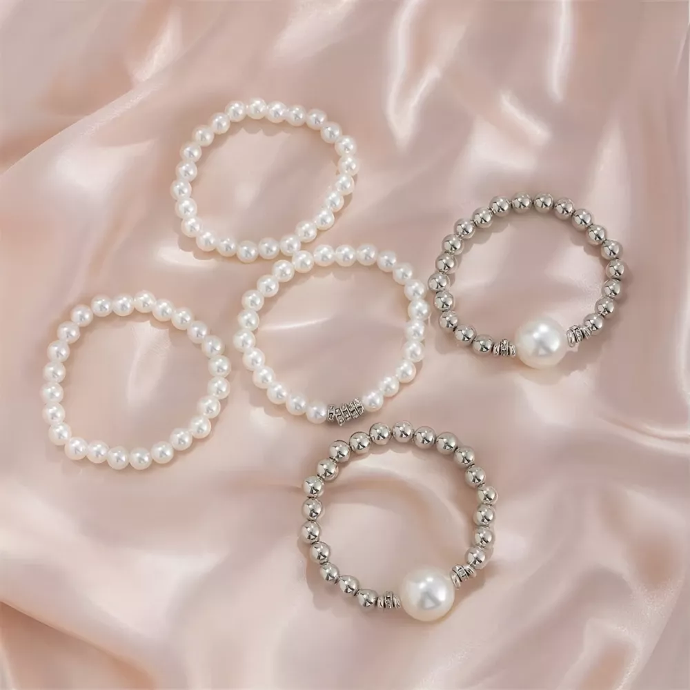 Bring a touch of effortless elegance to your look with this stunning 5-piece boho bracelet set. Designed with shimmering imitation pearls, chic chain details, and stylish elastic CCB beads, these bangles blend a modern goth vibe with timeless femininity. Whether you wear them stacked together or mix them with your favorite accessories, they instantly upgrade any outfit with a bold yet graceful charm.
