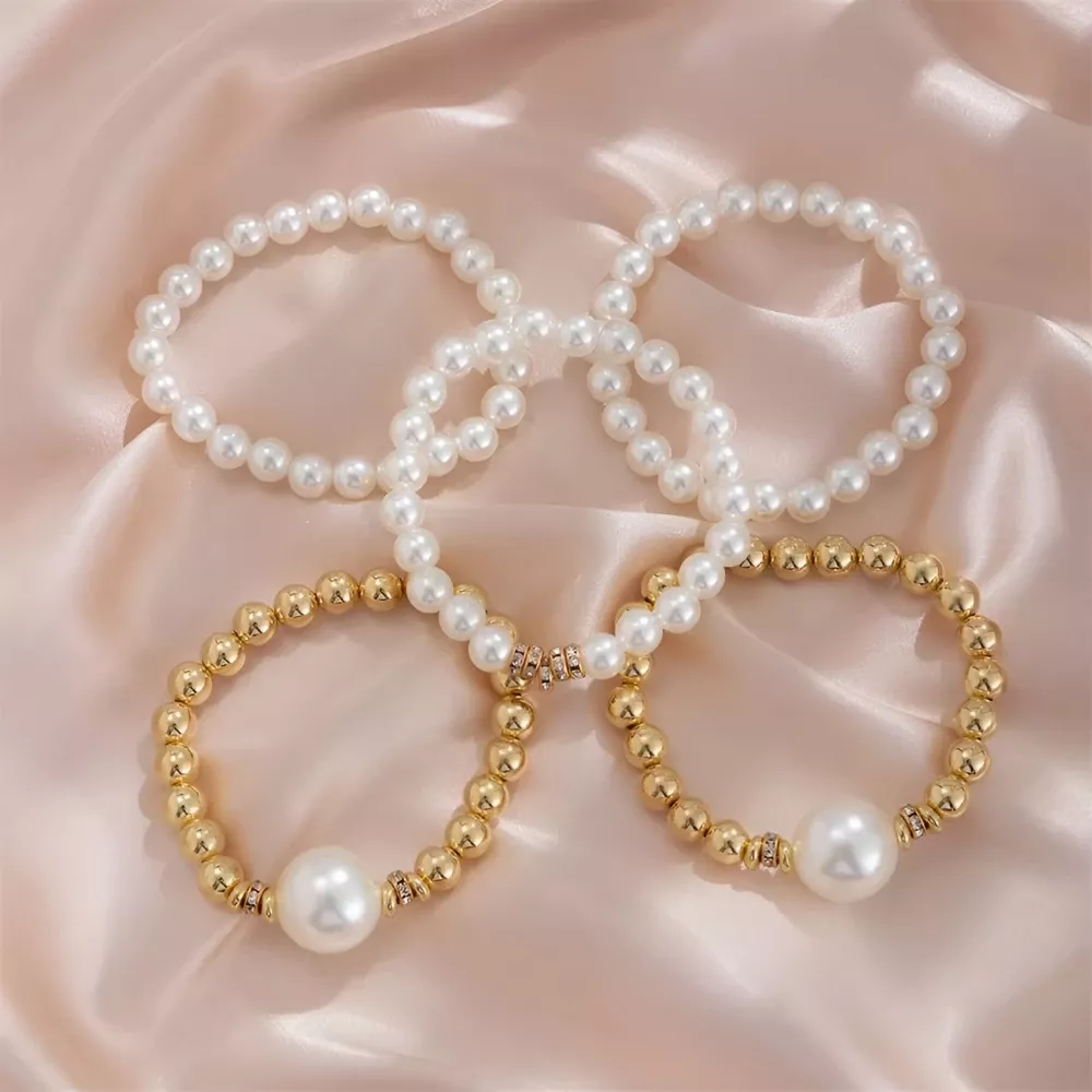 Boho Pearl Chain Bracelet Set for Women – 5Pcs Layered Beaded Bangles