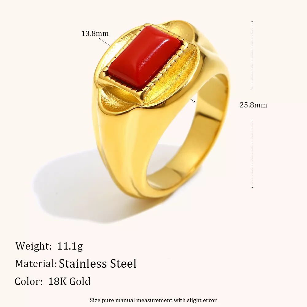 This ring is more than just a piece of jewelry—it’s an expression of your personal style. The geometric design gives it a unique and modern appeal, making it the perfect statement piece for both formal and casual occasions. Its vibrant red gemstone is sure to turn heads, while the 18K gold plating adds an air of luxury that will have you feeling like royalty every time you wear it.