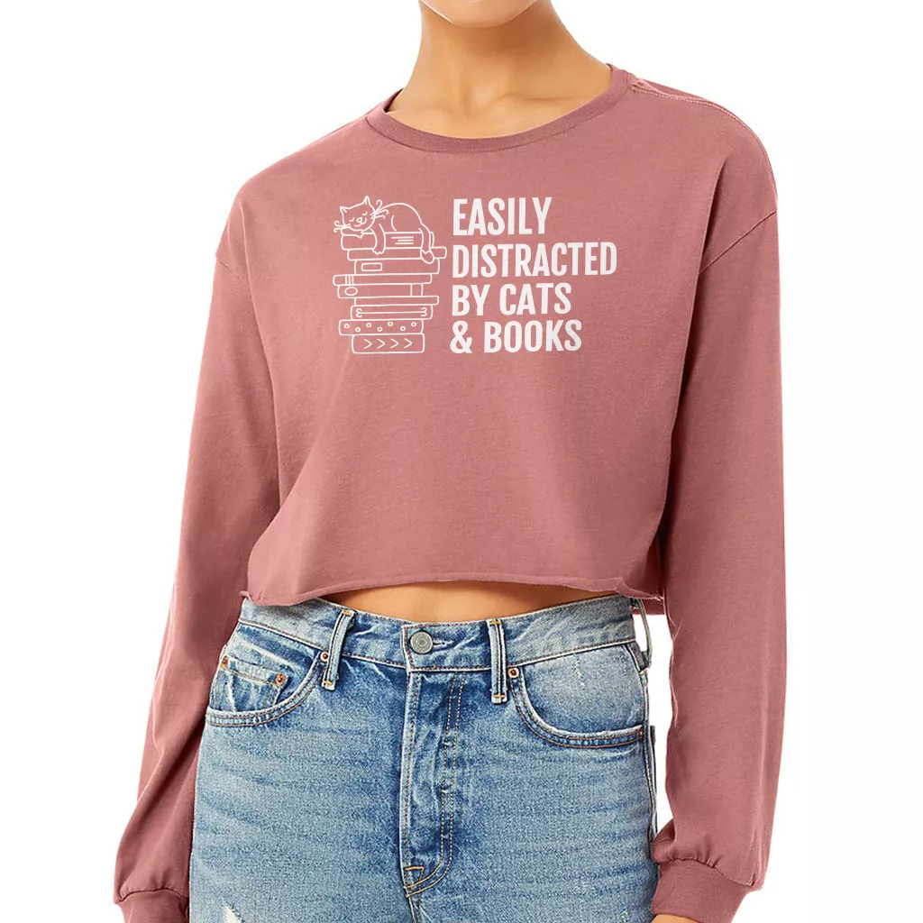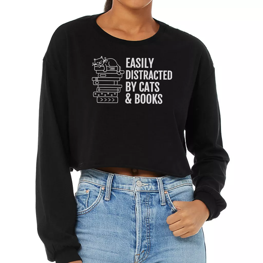 Easily Distracted By Cats And Books Cropped Long Sleeve Sweatshirt