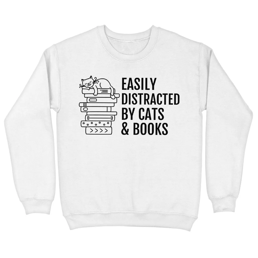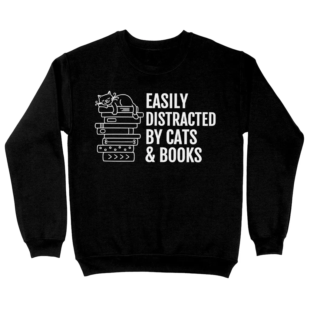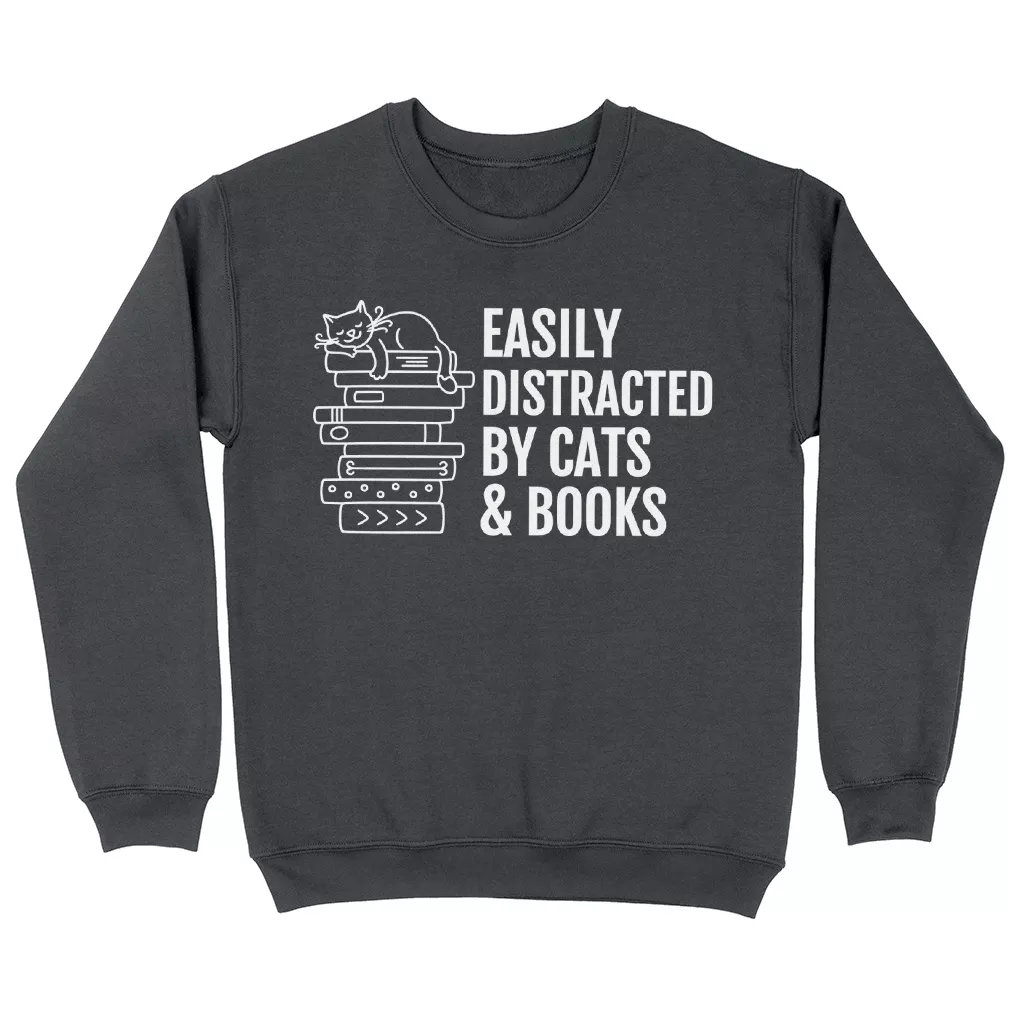 Easily Distracted By Cats And Books Sweatshirt – Book Lover Crewneck Sweatshirt – Cats and Books Unisex Sweatshirt