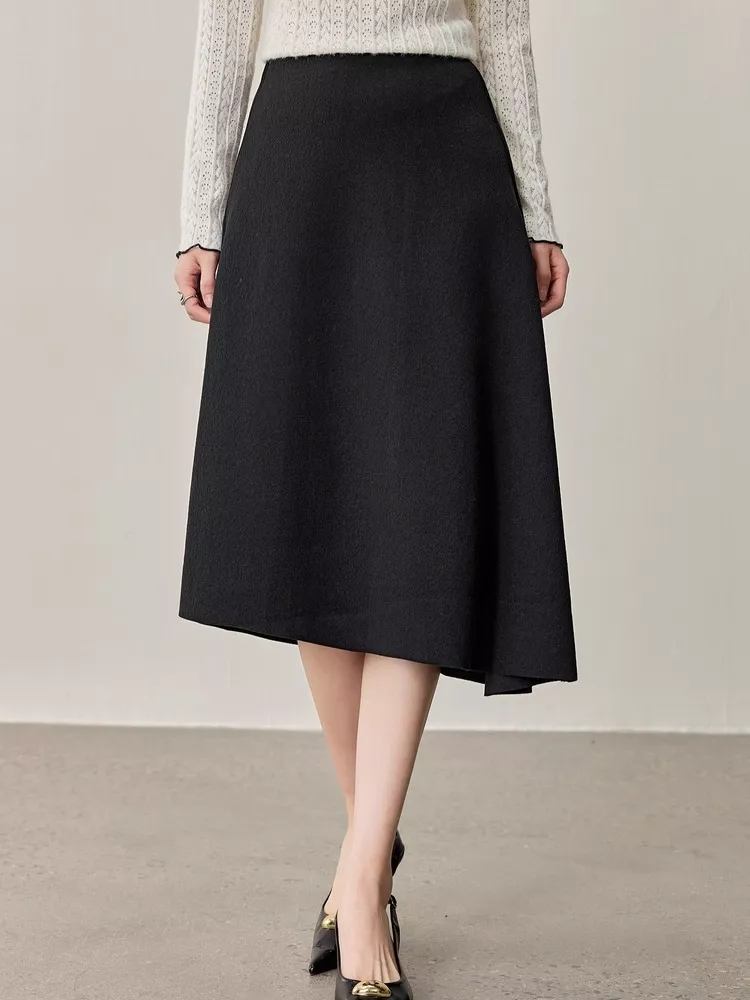 The midi length gracefully hits mid-calf, flattering all body types with a loose, flowing shape. The knitted fabric adds cozy texture without feeling bulky, making it ideal for year-round styling—pair it with a tucked-in blouse in spring or a soft turtleneck in winter. The solid black color and natural waistline make it versatile enough to dress up or down, while the asymmetrical detail adds a subtle yet modern twist.