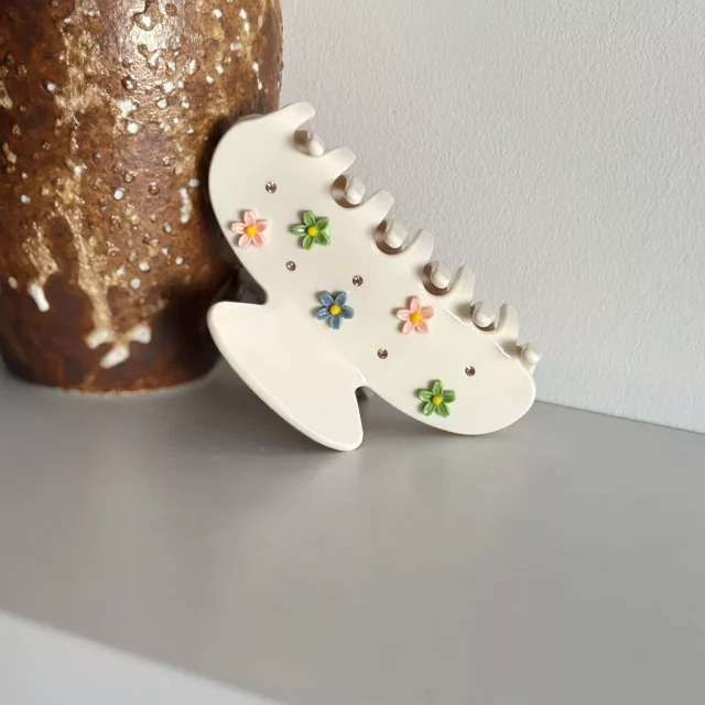 Upgrade your hair accessory collection with this timeless flower acetate hair claw clip. Its combination of beauty, durability, and comfort makes it a must-have for every season. Treat yourself to a stylish piece that effortlessly blends function and fashion. Order yours today and enjoy the perfect mix of charm and practicality.