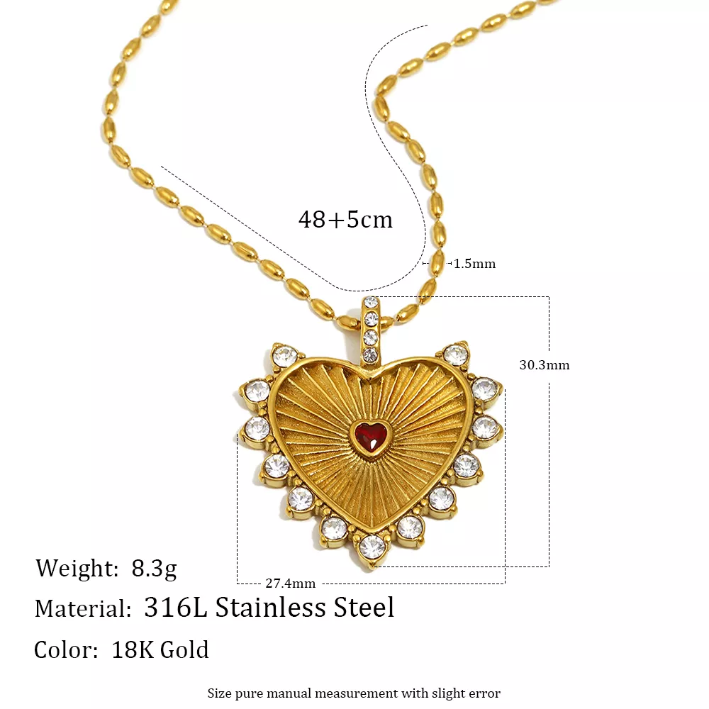 Elevate your style with this cute and elegant red heart pendant necklace. Crafted with precision from 316L stainless steel and finished with a shimmering gold plating, this necklace combines lasting durability with delicate beauty. The pendant features a sparkling zircon-accented heart, designed to catch the light and draw attention wherever you go. With a compact size of just 1.19 by 1.08 inches and a lightweight feel of 0.29 ounces, it’s comfortable for daily wear while making a subtle, sophisticated statement.