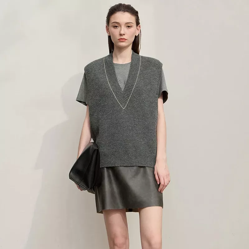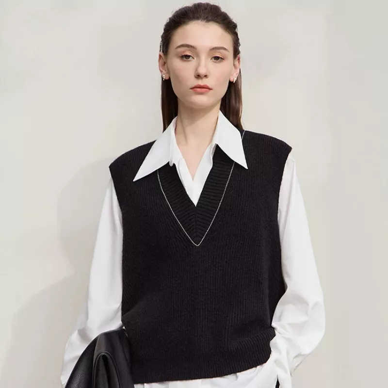 This knitted vest is made using a premium blend of acrylic, nylon, polyester, and microfiber—offering medium stretch and a smooth, soft feel against the skin. The standard thickness ensures just the right amount of warmth during chilly afternoons or cool indoor environments. With delicate beading as a subtle decorative detail, it elevates a simple solid-color look into something quietly striking. Its pullover design and sleeveless cut make layering effortless, allowing it to pair beautifully with shirts, blouses, or turtlenecks underneath.