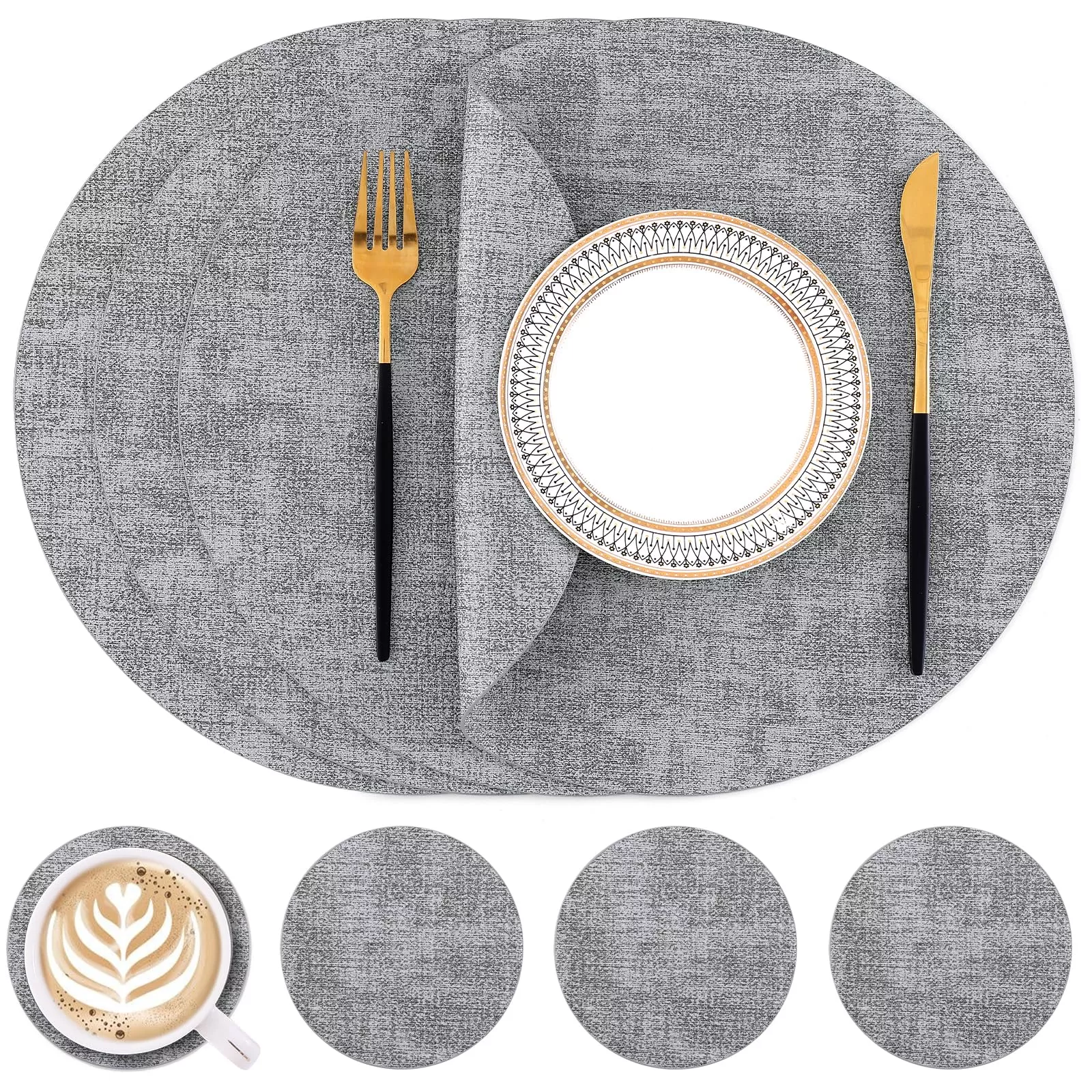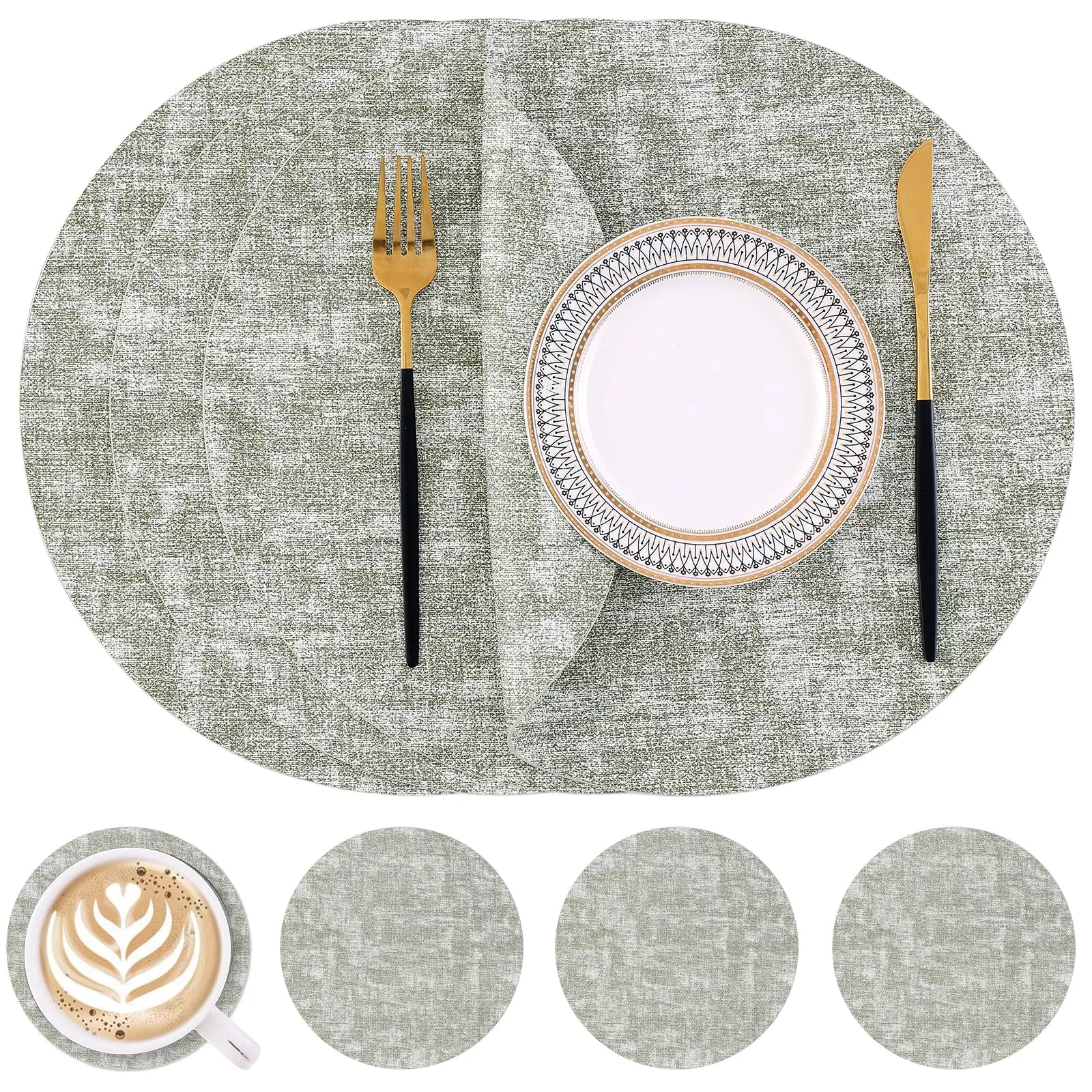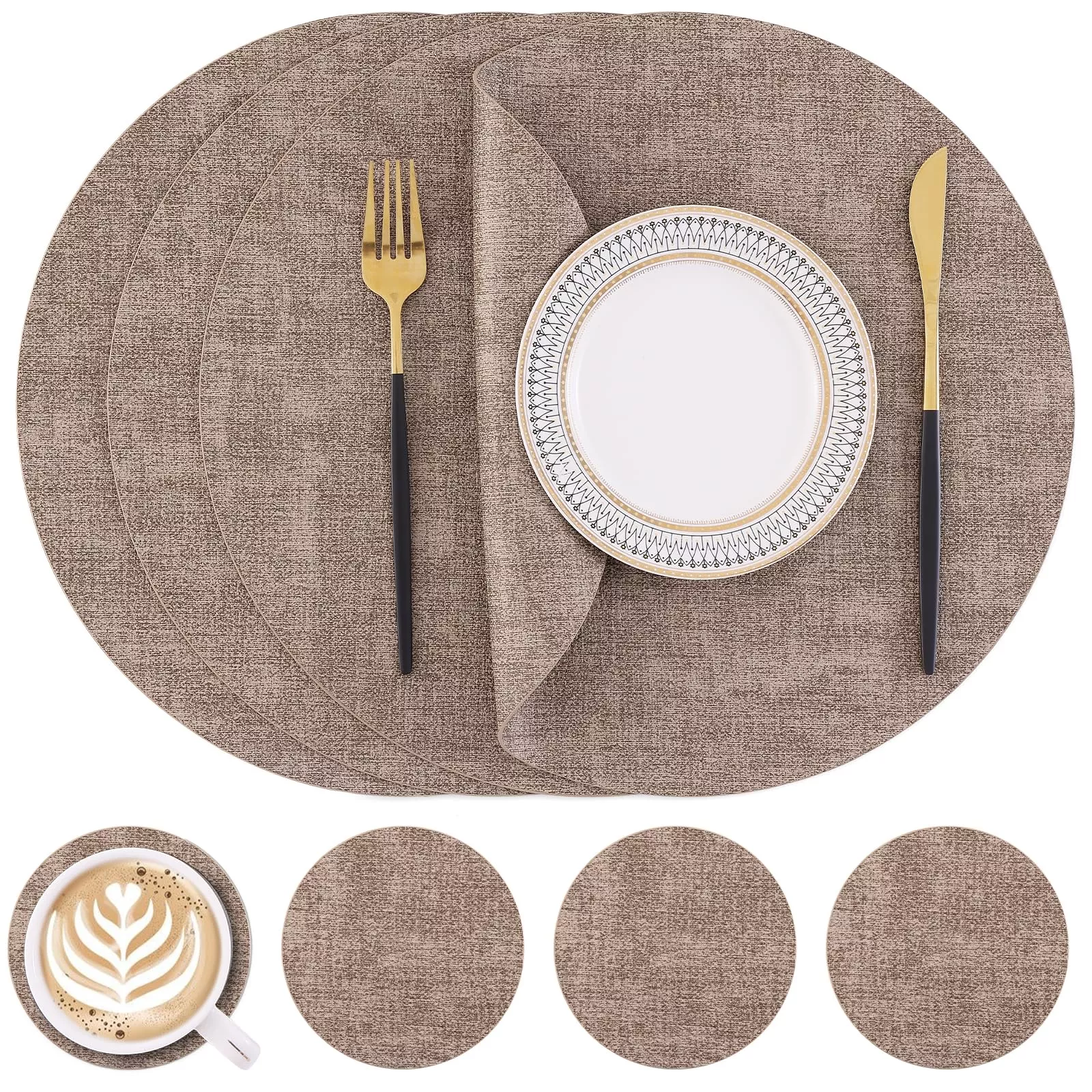 Crafted from high-quality faux leather, each placemat measures 13 inches in diameter and each coaster 3.93 inches, with a sturdy 0.08-inch thickness for lasting use. These mats are heat-resistant up to 212°F (100°C), protecting your table from hot plates, pans, or cups. The double-sided linen texture enhances grip while providing a smooth, non-slip surface that stays perfectly in place during meals.