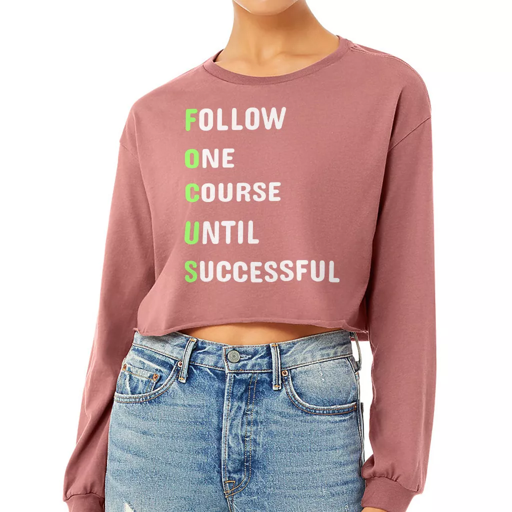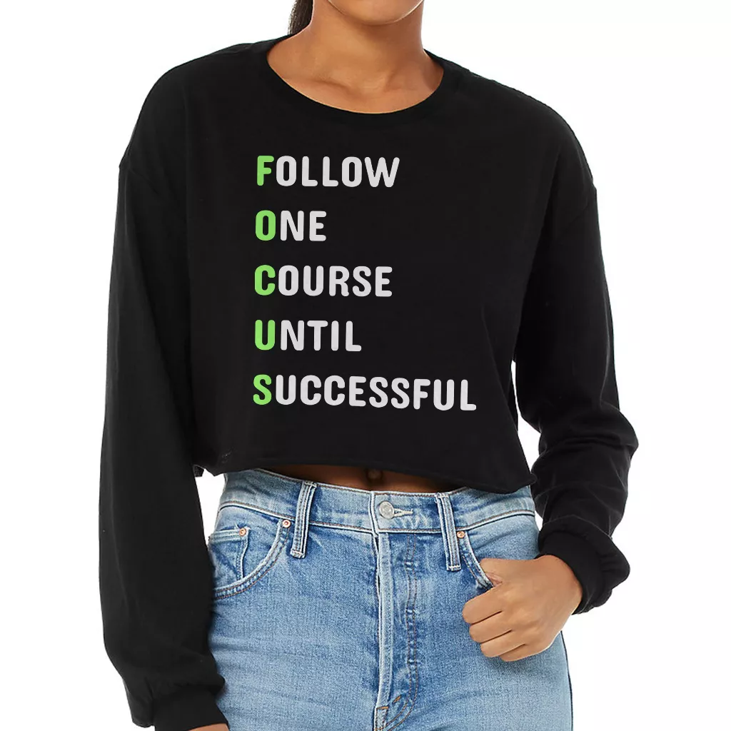 Focus Word Art Cropped Long Sleeve Sweatshirt – Motivational Quote Women’s Crop Top – Success Mindset Long Sleeves Pullover