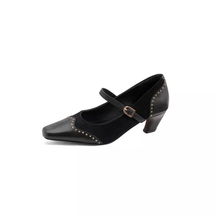 Genuine Leather Square Toe Mary Jane Heels with Rivet Detail