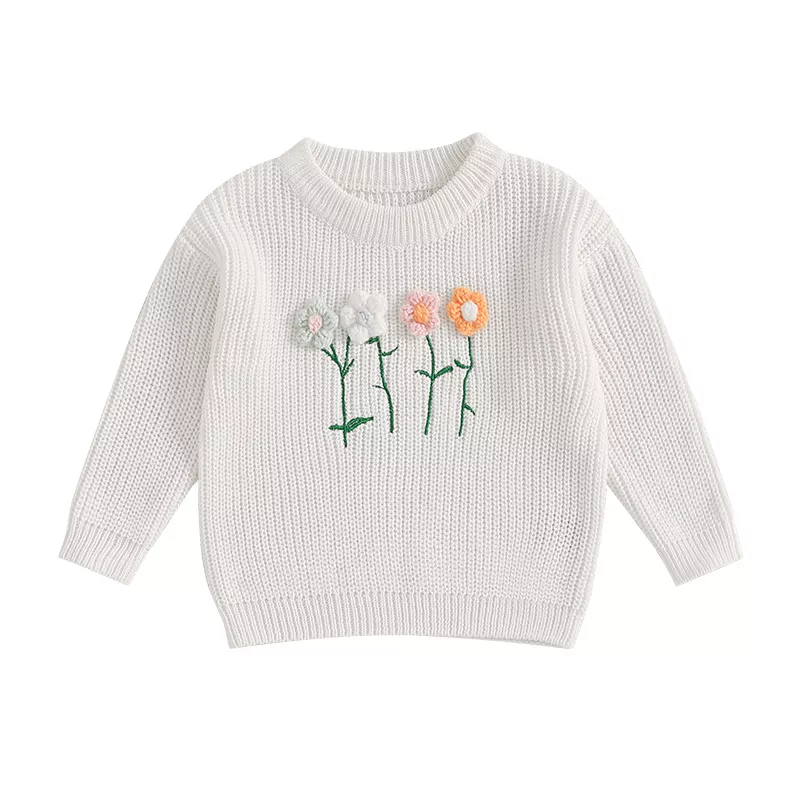 Keep your little one cozy and stylish with this adorable  Girls Long Sleeve Crew Neck Flower Sweater. Designed to add charm and warmth to her wardrobe, this sweater is a must-have for those chilly days. The soft cotton blend ensures comfort, while the cute floral design brings a touch of fun to any outfit. Ideal for casual daily wear, it’s easy to pair with jeans, skirts, or leggings, making it a versatile piece for any occasion.