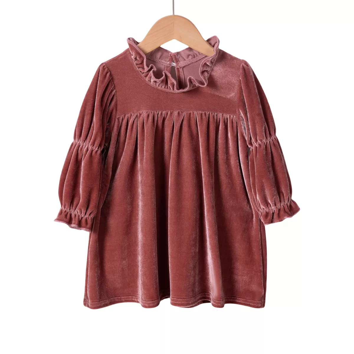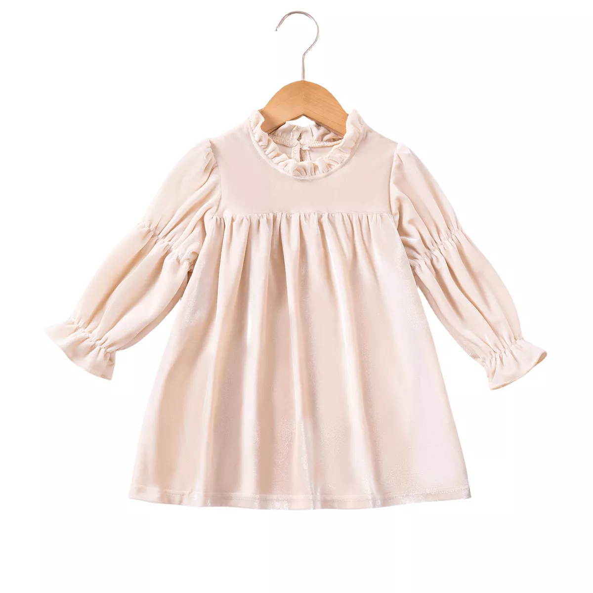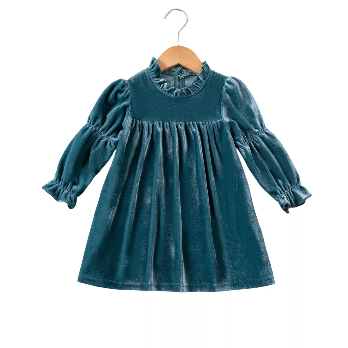 Dress your little one in charm and comfort with this adorable long sleeve velvet dress. Designed for girls ages 1-5 years, it blends playful elegance with everyday practicality. The ruffled round-neck and puff-sleeve design add a sweet and fashionable touch, while the gathered waistline creates a flattering silhouette that looks beautiful on every child.