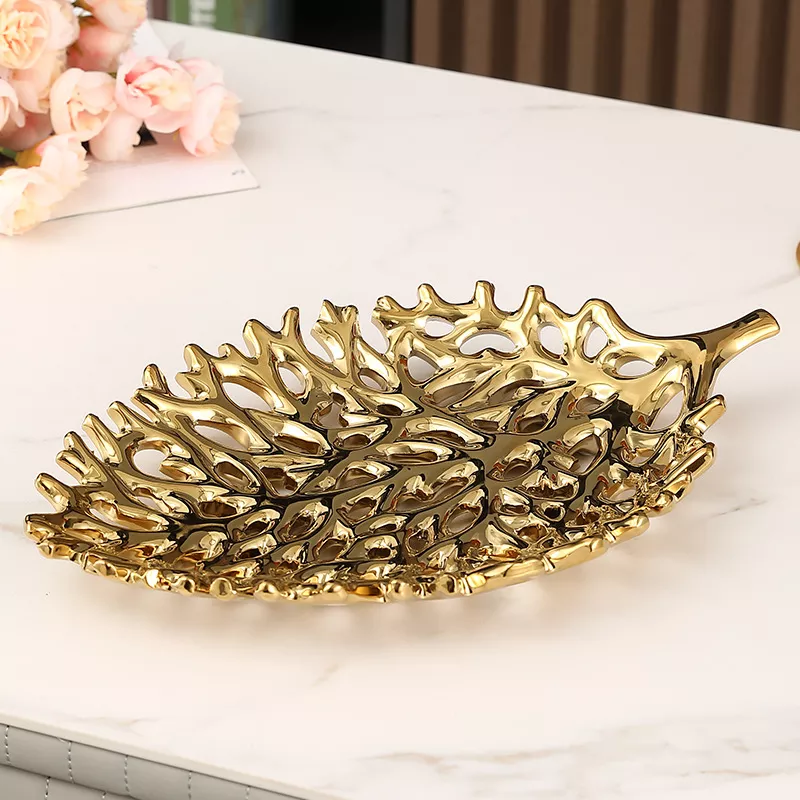 Golden Leaf Ceramic Fruit Plate & Decorative Storage Tray