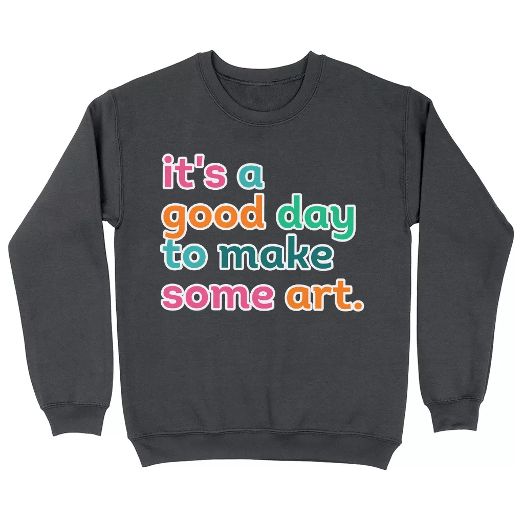 It’s A Good Day To Make Art Sweatshirt is made from a 50% U.S. Cotton/50% Polyester blend, this warm 8.0 oz sq/yd classic fit style looks great and makes a great canvas for decorating. It’s A Good Day To Make Art Sweatshirt is designed and printed in California.