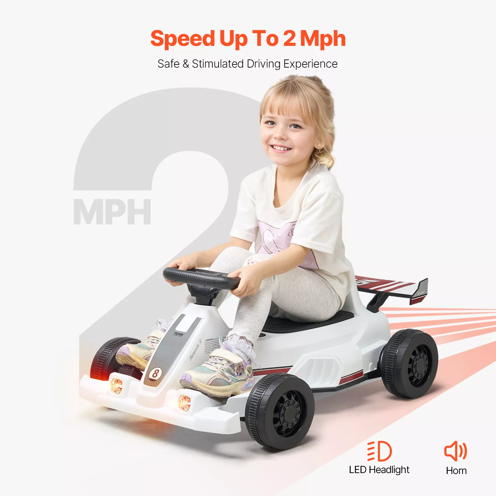 This electric go kart is built with children in mind. A strong frame and four wide wheels create a stable base that helps prevent tipping, even during turns or on uneven ground. The low, preset speed of about 2 mph keeps rides smooth and controlled, giving parents peace of mind while kids enjoy the thrill of driving.