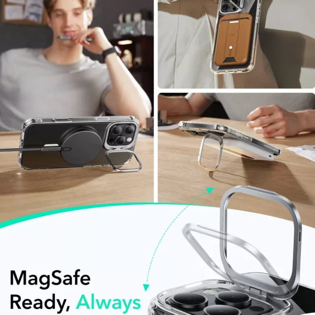 • Adjustable Camera Kickstand: Hidden stand around the camera frame for hands-free viewing at any angle without blocking the MagSafe ring.
