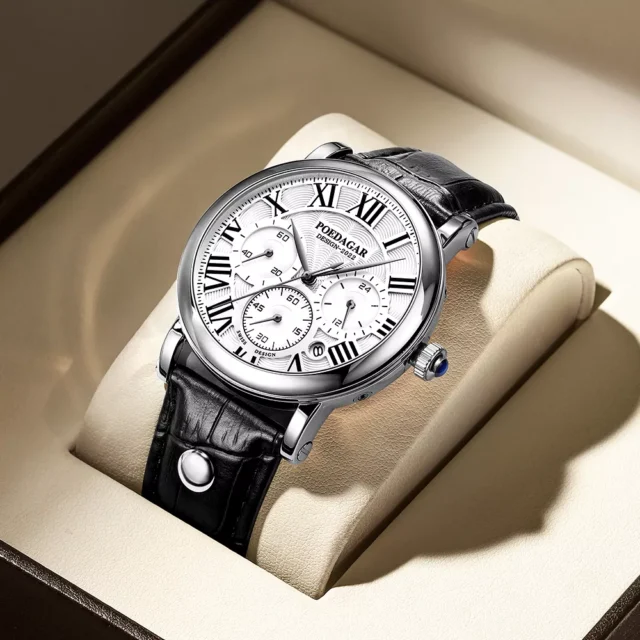 Unlike ordinary watches, this piece is designed for the modern business man who values sophistication without sacrificing function. Its luminous dial ensures clarity even in low light, while the chronograph and calendar features make it highly practical. The elegant leather band and Roman numeral display bring a refined, classic look that suits formal business attire as well as smart-casual outfits. Whether you’re at a board meeting, attending an evening event, or traveling, this watch delivers both style and reliability.