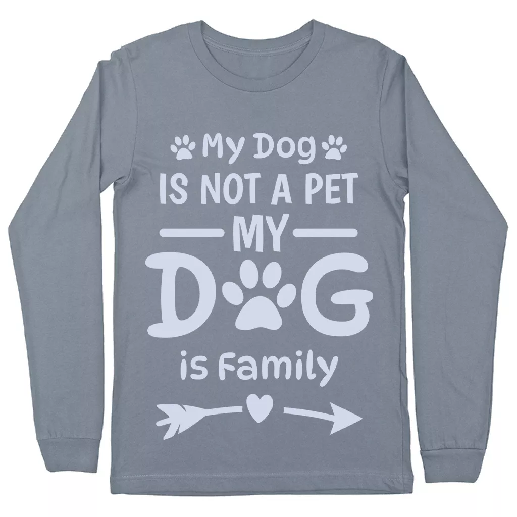 My Dog Is Not a Pet My Dog Is Family Long Sleeve T-Shirt is proudly made with 7x less water than average manufacturers, in recycle-friendly facilities that also guarantee zero sweatshop conditions. My Dog T-Shirt is designed and printed in California.