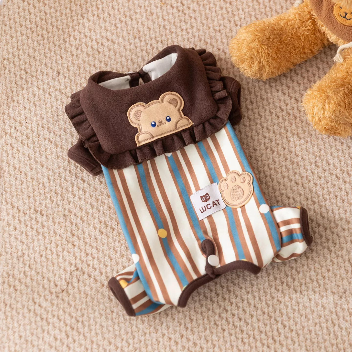 Crafted from soft, breathable polyester fiber, this jumpsuit features a unique striped pattern and a cute bear design on the belly. The button-down shirt style adds an extra touch of sophistication while ensuring easy wear for your pet. It’s available in two gorgeous colors: pink and coffee, making it easy to match your dog’s personality and look.