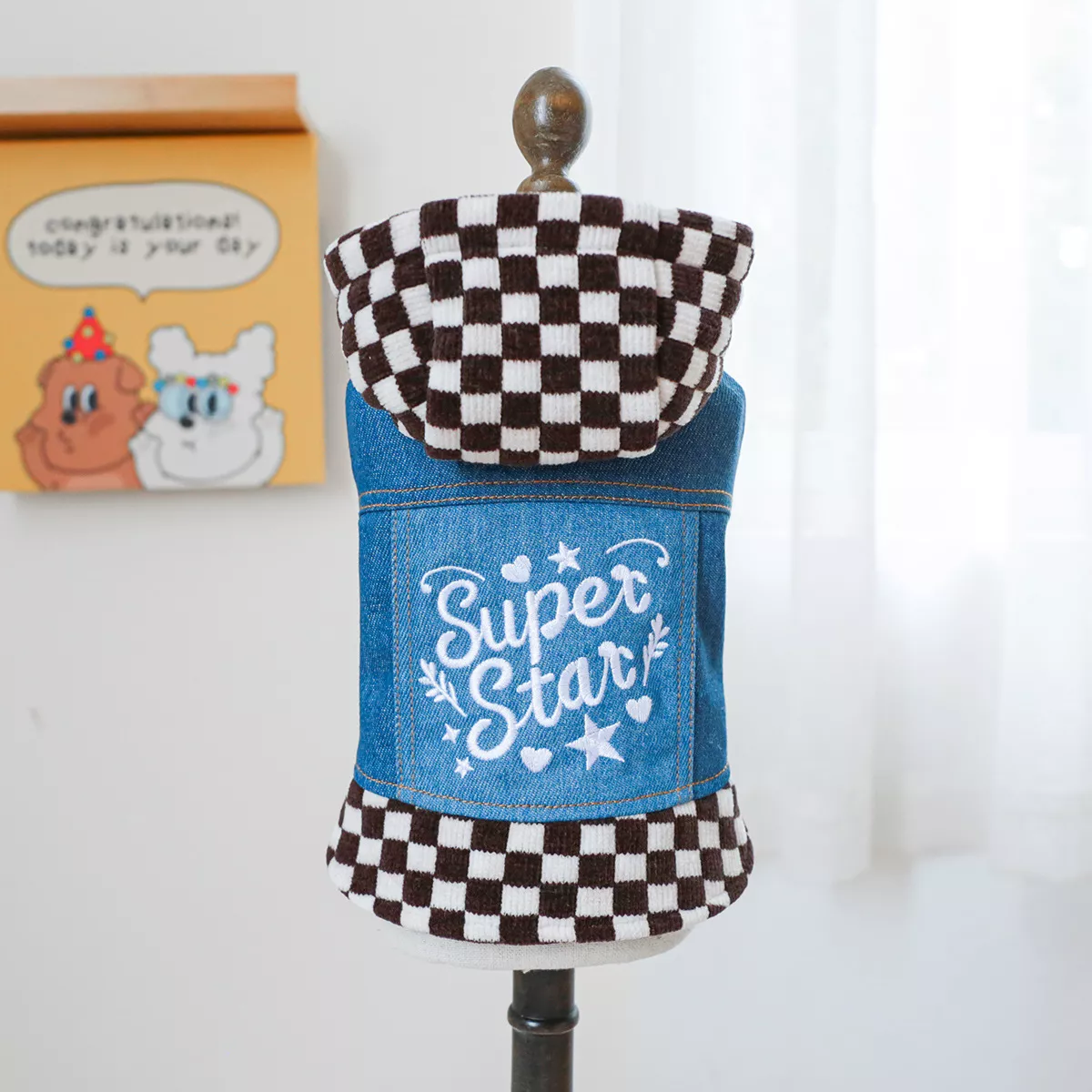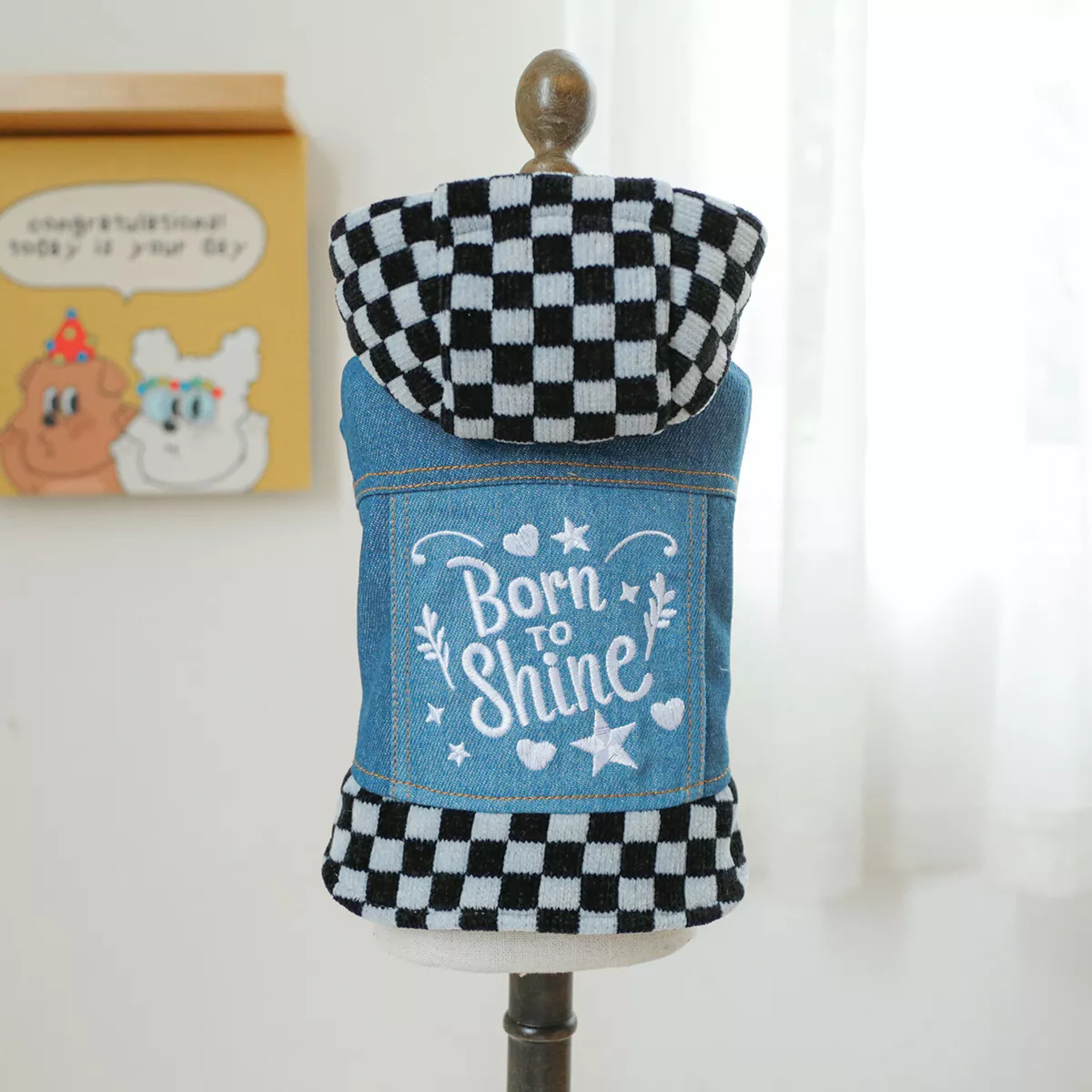 Pet Plaid Hooded Sweatshirt with Denim Splicing – Stylish Dog Coat for Small Dogs