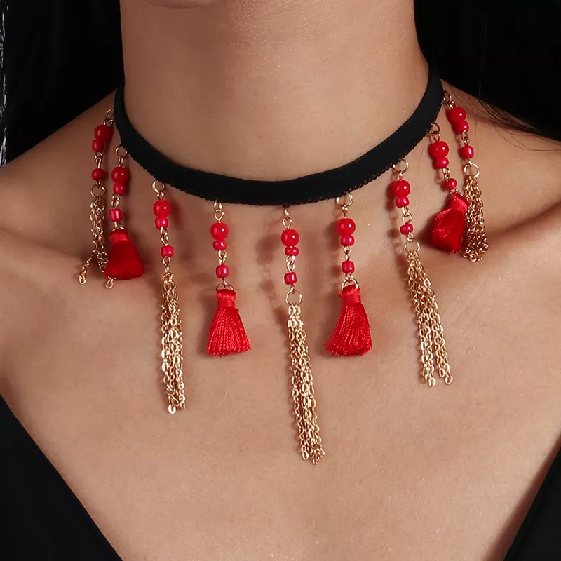 Make every outfit unforgettable with this stunning red and black velvet choker necklace. Designed with soft lace, delicate tassels, and a chic bohemian flair, this necklace is more than just jewelry – it’s a statement of confidence, allure, and individuality. Whether you’re dressing up for a party, festival, or romantic evening, this accessory instantly adds a touch of drama and elegance to your look.