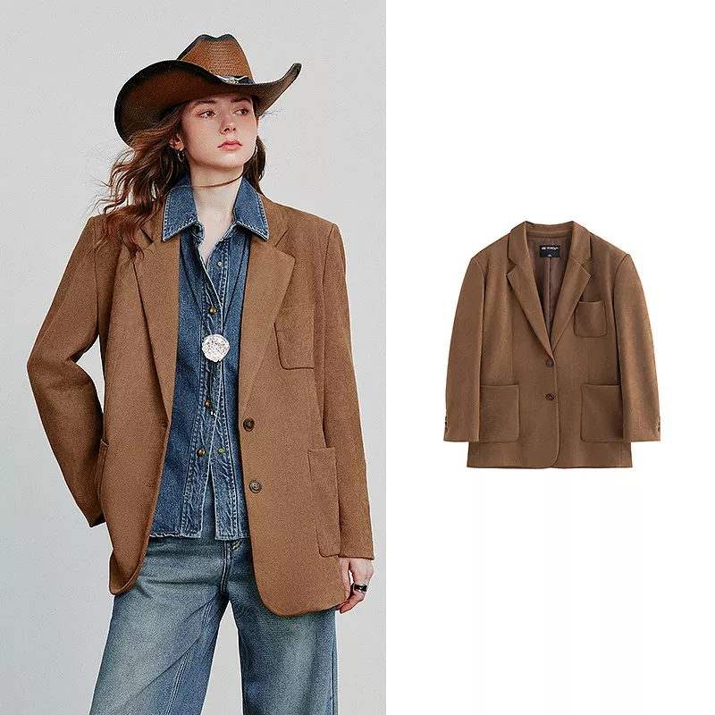 Retro Brown Suede Women’s Blazer – Lightweight Single Breasted Coat