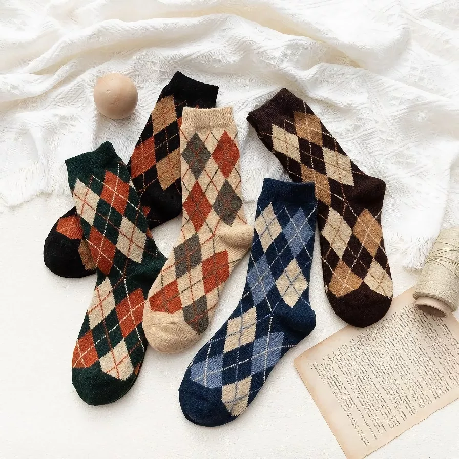 Step into effortless elegance with these retro plaid mid-calf socks designed to elevate your everyday outfits. Inspired by classic patterns and modern comfort needs, this 5-pair set brings warmth, softness, and style together in one essential wardrobe upgrade. The plaid and rhombus patterns add a refined, vintage touch that feels both fashionable and easy to wear. Whether you are dressing up for the day or relaxing at home, these socks are made to complement your lifestyle with ease.