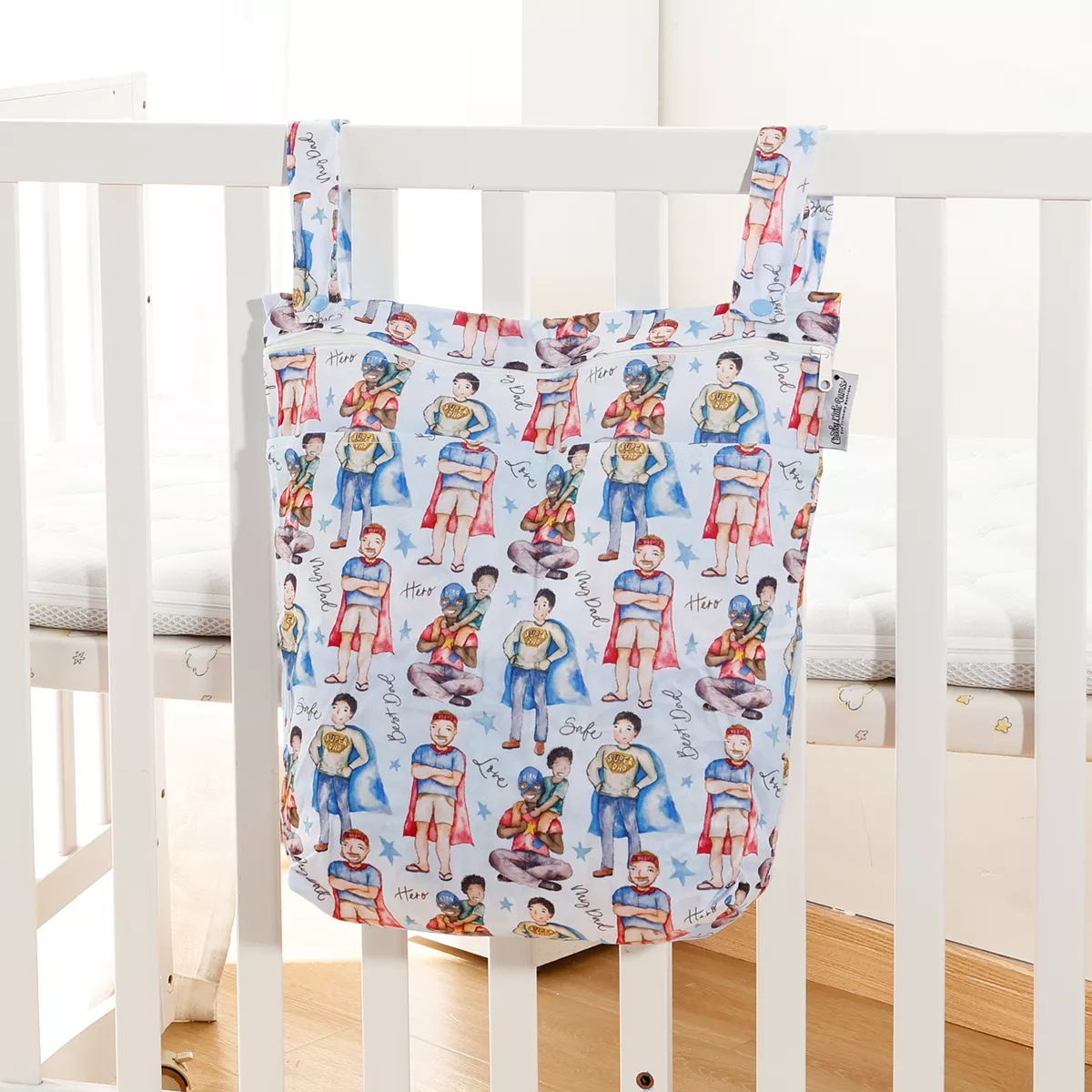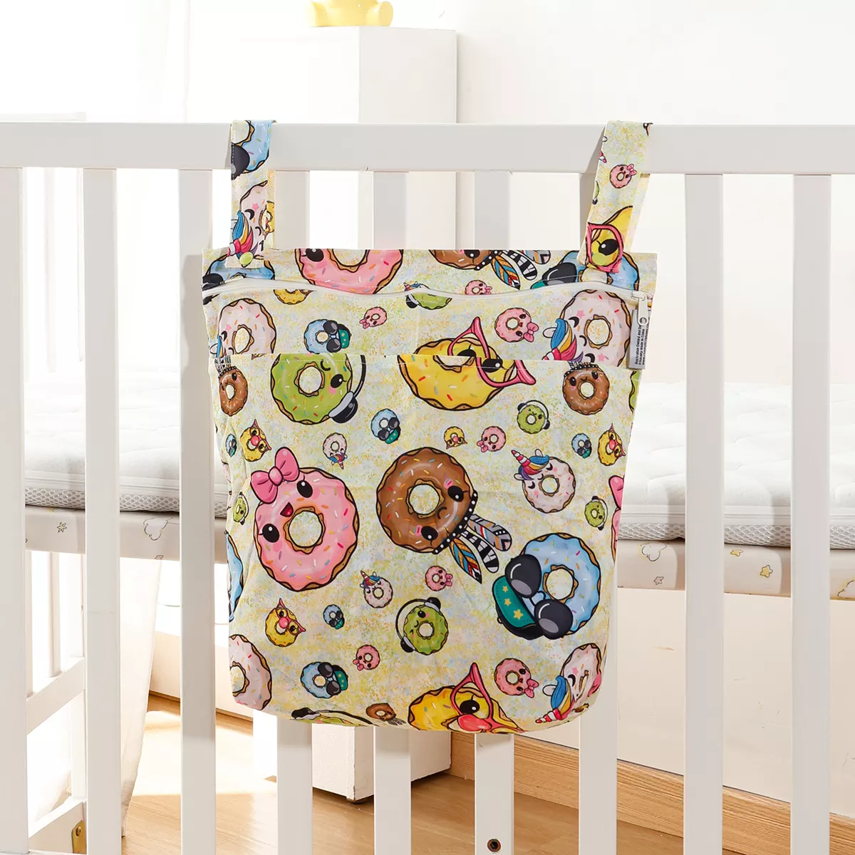 This diaper bag features two separate zippered compartments, allowing you to store clean and used items in one convenient place. The waterproof lining helps contain moisture and odors, while the sturdy zipper closures keep everything secure. A built-in hanging strap makes it easy to attach to strollers, diaper bags, hooks, or car seats for quick access.