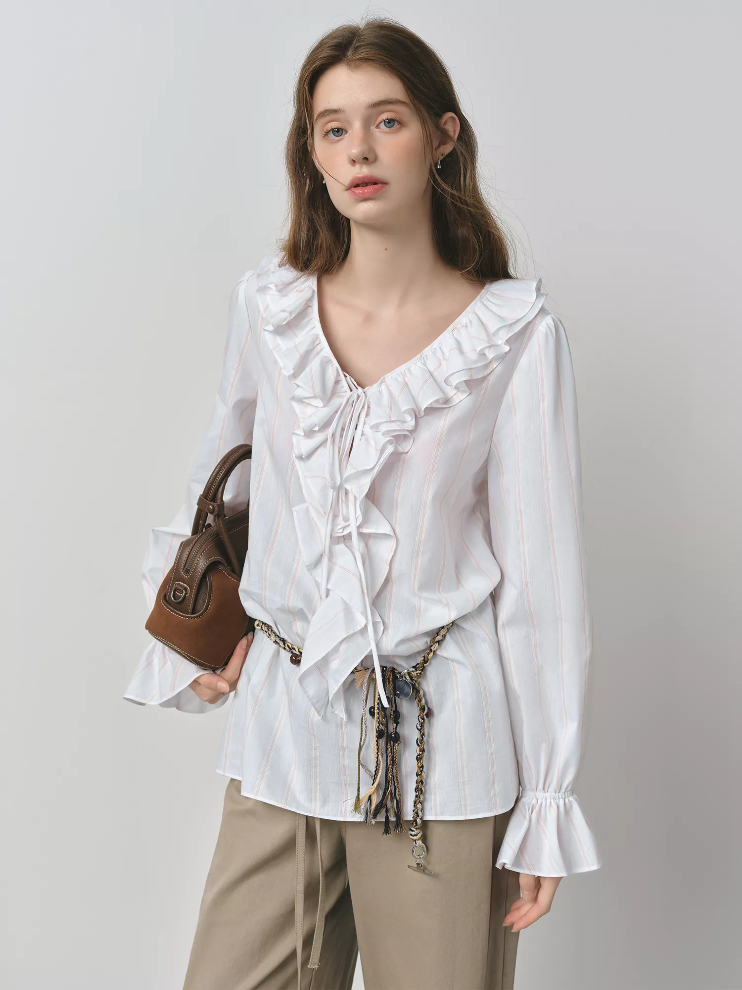 Romantic Ruffled Retro V-Neck Long Sleeve Blouse