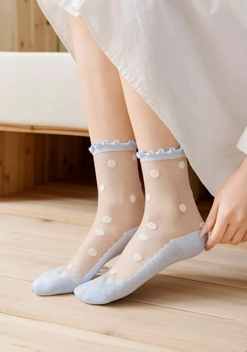 Add a touch of charm to your outfit with these ultra-thin sheer polka dot socks designed to look light, playful, and effortlessly stylish. The transparent crystal-silk look paired with delicate ruffle edges creates a soft, feminine vibe that instantly elevates your shoes and outfit. Whether you love kawaii fashion, sweet Lolita aesthetics, or simply want something cute and different, these socks bring personality without trying too hard.