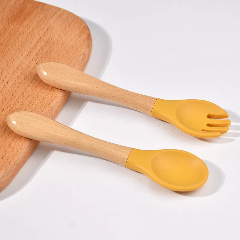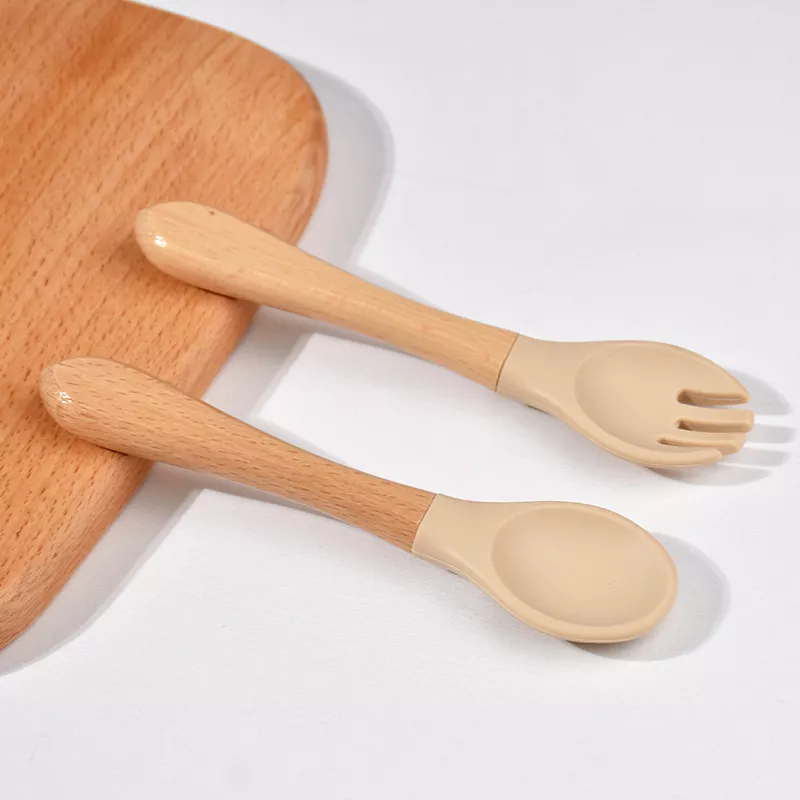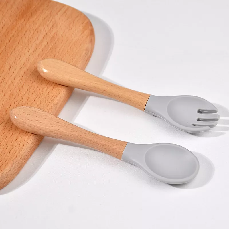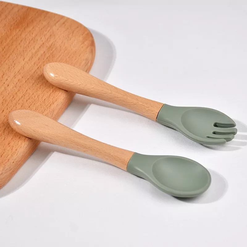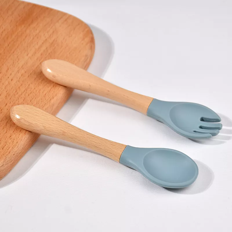 SoftGrip Silicone Baby Fork & Spoon Set with Wooden Handles