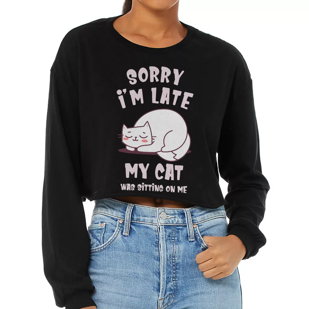 Sorry I’m Late My Cat Was Sitting On Me Cropped Long Sleeve Sweatshirt – Cool Cat Women’s Crop Top – Funny Graphic Long Sleeves Pullover