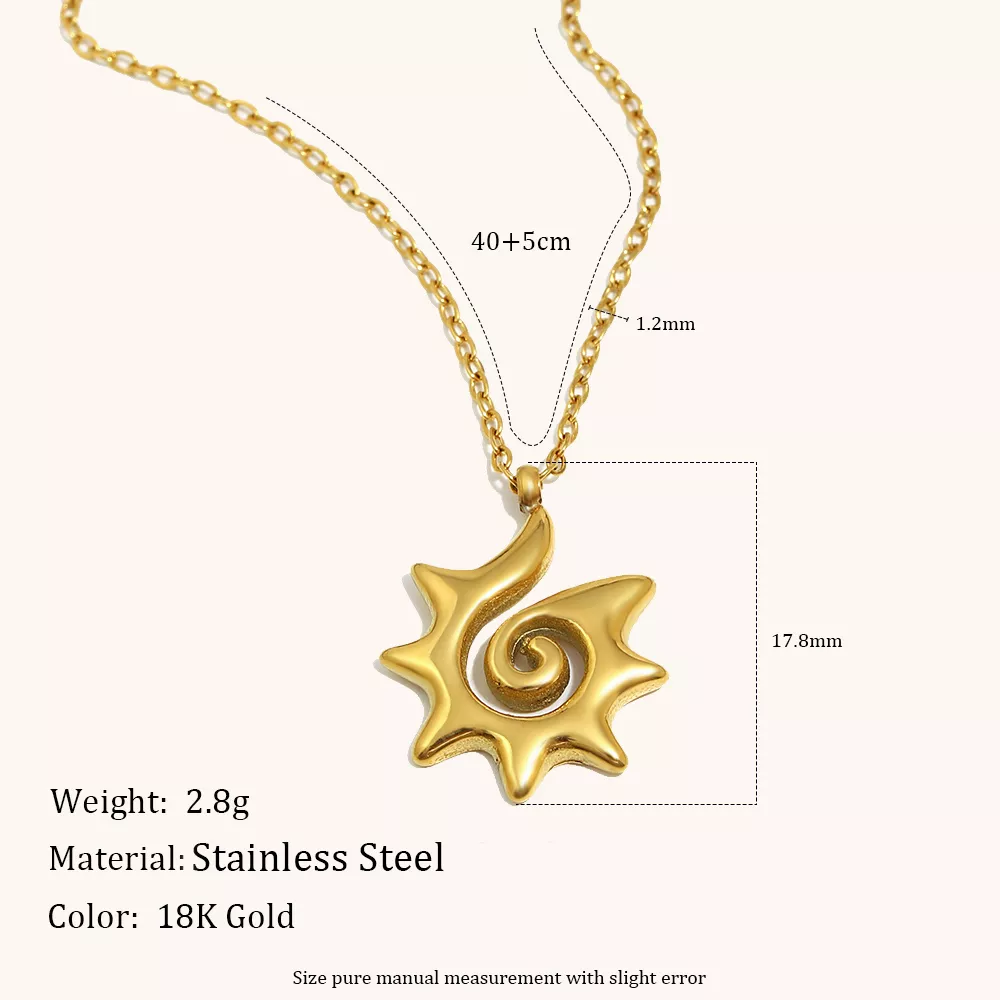 The Spiral Sun Shaped Pendant Necklace is not just a piece of jewelry—it’s a reflection of personal style and a statement of confidence. The unique spiral sun design symbolizes growth and renewal, making this necklace a meaningful addition to any jewelry collection. Its high-quality stainless steel and 18K gold plating ensure that it remains a long-lasting favorite, while the hypoallergenic and waterproof features make it practical and comfortable for daily wear.
