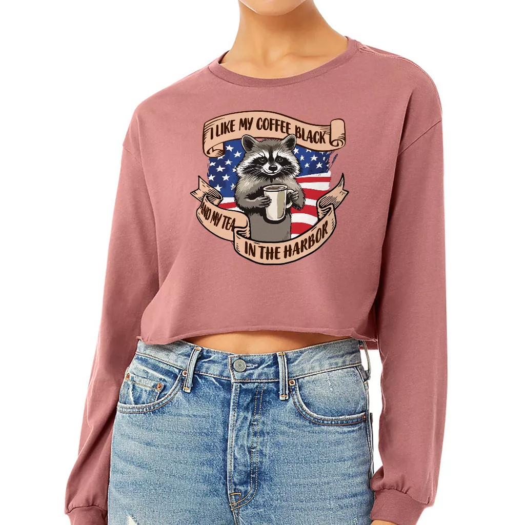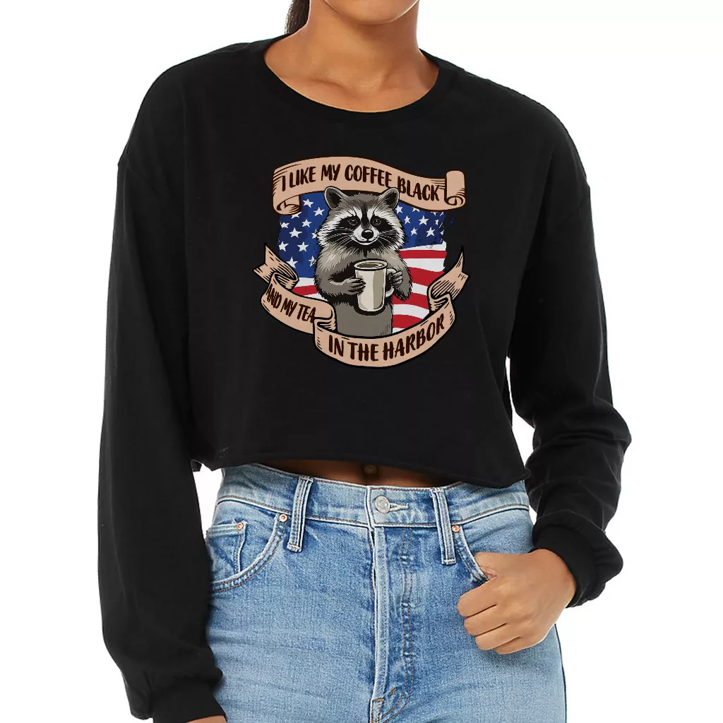 Tea in the Harbor Cropped Long Sleeve Sweatshirt – Cool Quote Women’s Crop Top – Funny Raccoon Long Sleeves Pullover