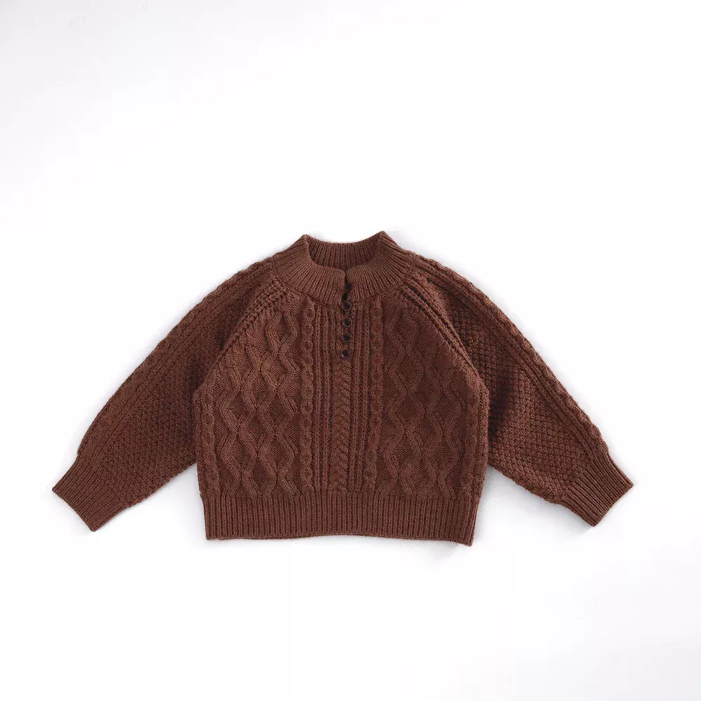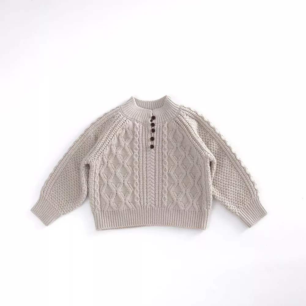 Crafted from breathable, high-quality cotton, it keeps your child toasty without overheating. The cable knit texture adds a charming, retro-inspired touch, while the stretchy fit ensures easy movement during active play. The mock neck with button detail not only adds style but also offers extra warmth and easy wearability. Plus, the slightly oversized chest design makes it perfect for layering over t-shirts or under jackets.