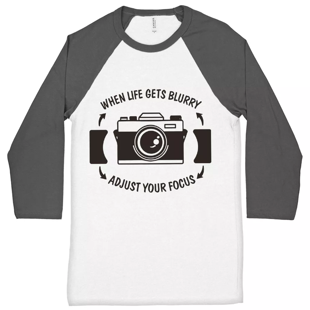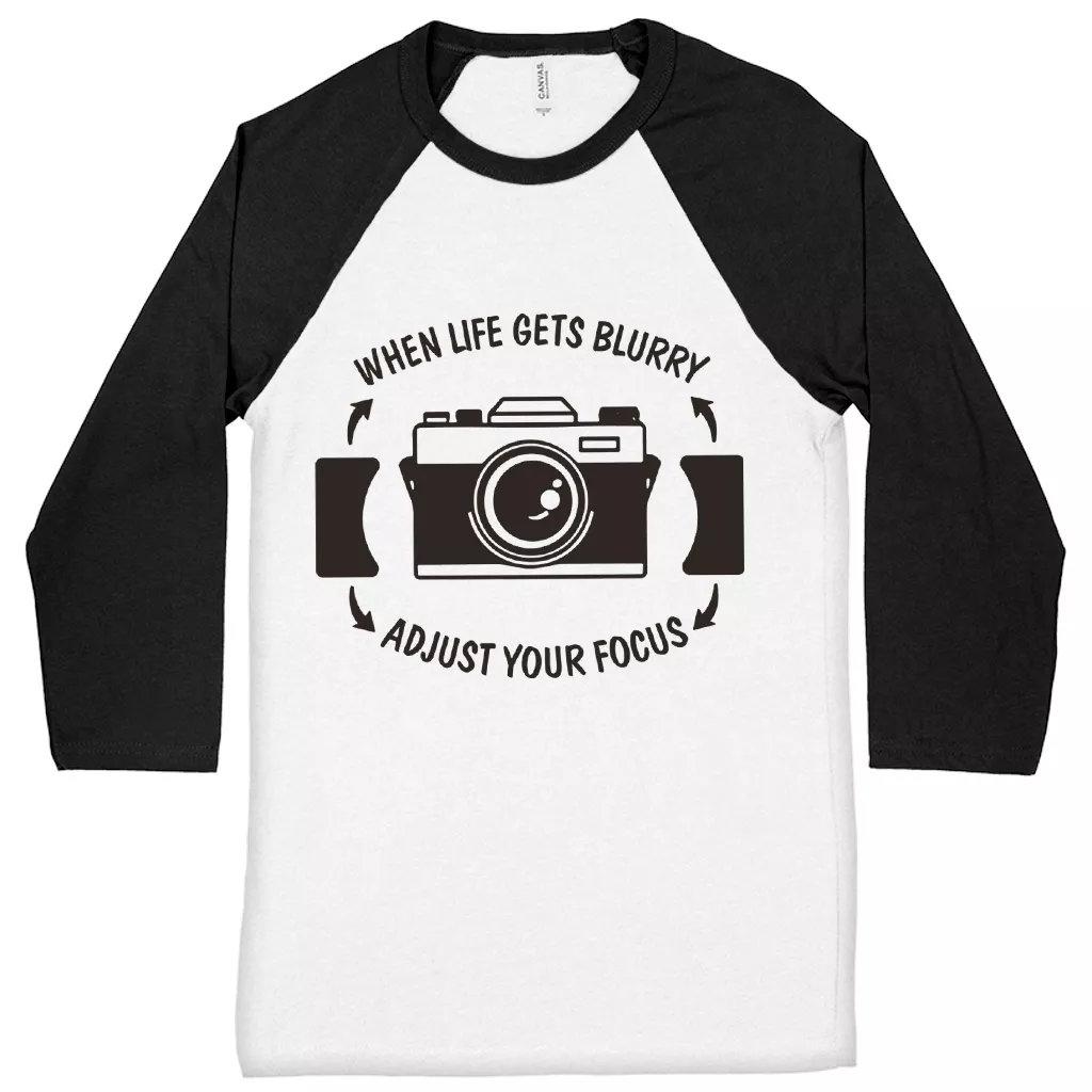 When Life Gets Blurry Adjust Your Focus Baseball T-Shirt – Camera 3/4 Sleeve – Funny Photographer Raglan Jersey Shirt