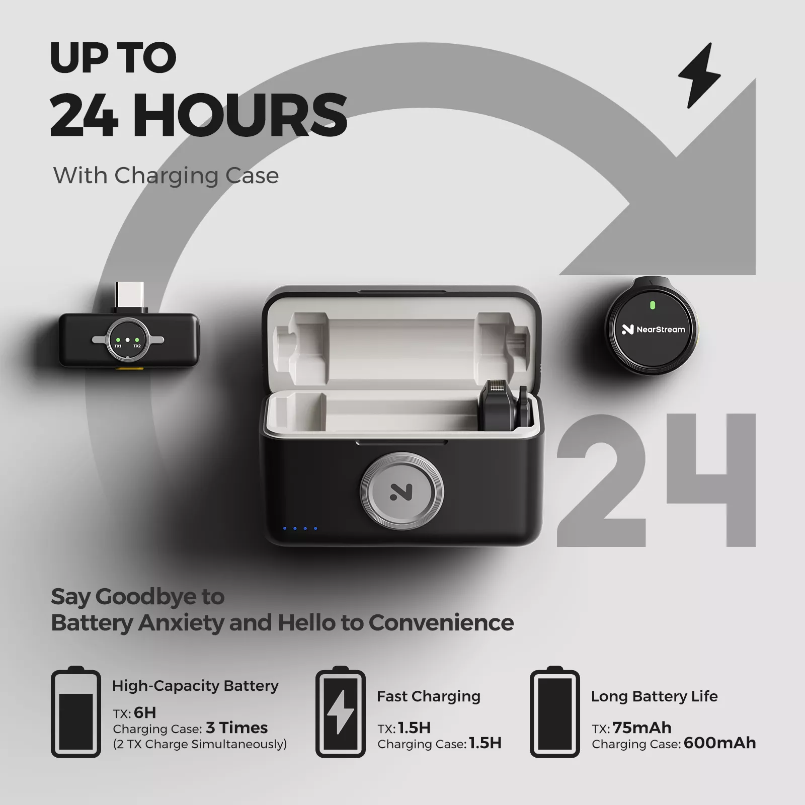 Record longer without worrying about power. The microphone delivers up to 6 hours of continuous use, while the compact charging case extends total battery life up to 24 hours. This makes it ideal for long shoots, travel days, events, or back-to-back meetings.