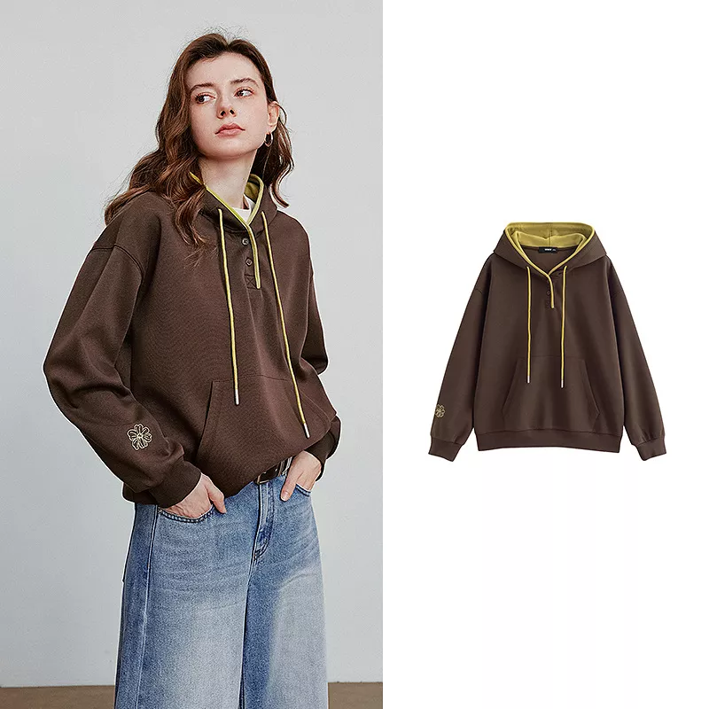 Women’s Autumn Hoodie with Embroidery & Contrasting Color Pullover Top
