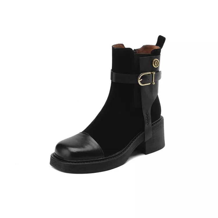 Women’s Autumn Square Toe Chunky Heel Zip Boots – Cow Suede Leather Short Boots with Belt Buckle